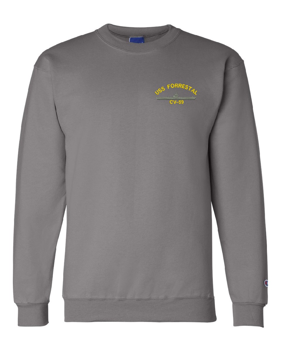 MilitaryBest is proud to offer this USS Forrestal CV-59 Sweatshirt. This Sweatshirt honors the service of our U.S. Navy personel who have served aboard this ship protecting our freedom with pride. Choose from an assortment of colors in sizes Small through 3XL. These are perfect for honoring your USS Forrestal Navy Veteran. For an additional cost you can also have your Rank & Rate embroidered on the left sleeve of the Sweatshirt. All embroidery is performed to order at our facilities in Scottsboro, Alabama by Americans with a passion for patriotism!