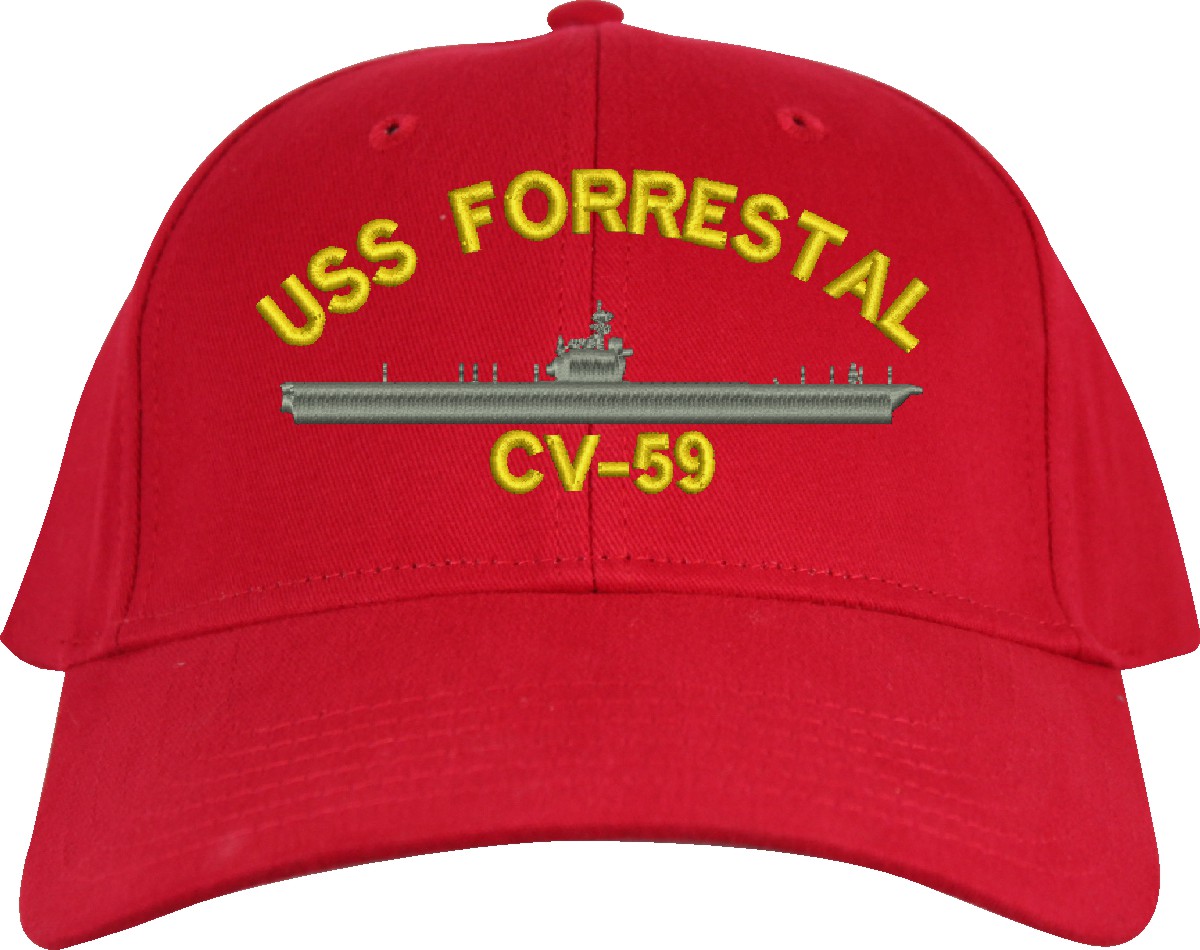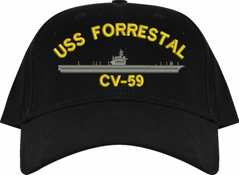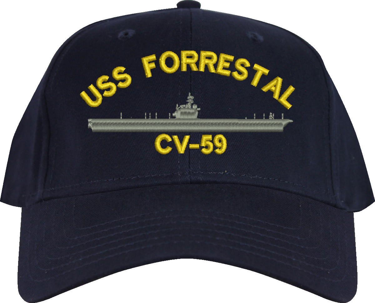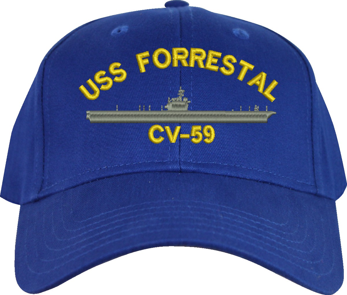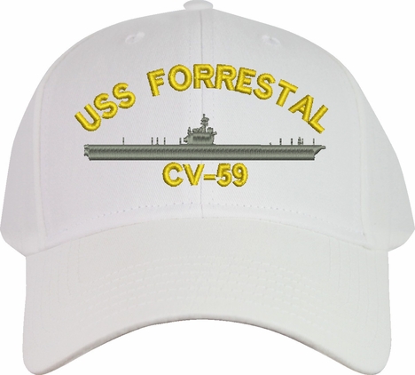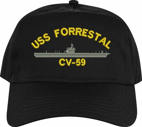 All Text on custom orders will be embroidered in ALL CAPITAL LETTERS.MilitaryBest is proud to offer this USS Forrestal CV-59 Imported Cap. This Cap honors the service of our U.S. Navy personel who have served aboard this ship protecting our freedom with pride. Choose from an assortment of colors in High or Low Profile. These are perfect for honoring your USS Forrestal Navy Veteran. For an additional cost you can also have your Custom Text embroidered on the back of the ball cap. All embroidery is performed to order at our facilities in Scottsboro, Alabama by Americans with a passion for patriotism!
