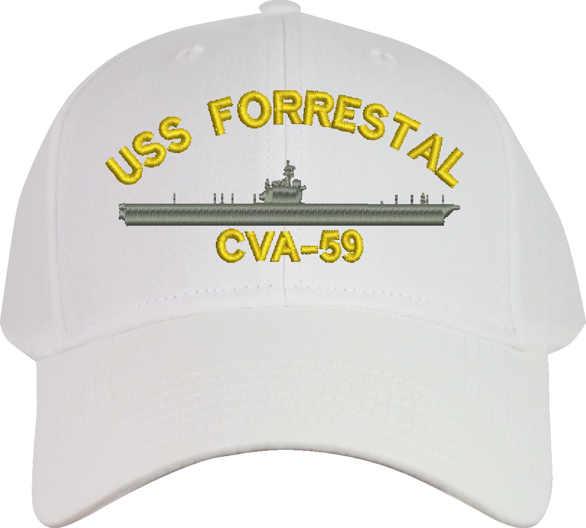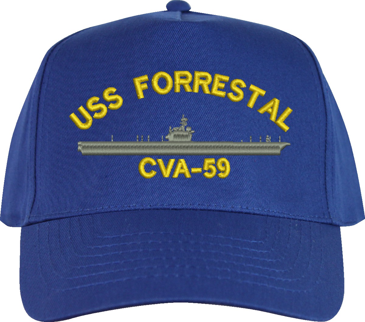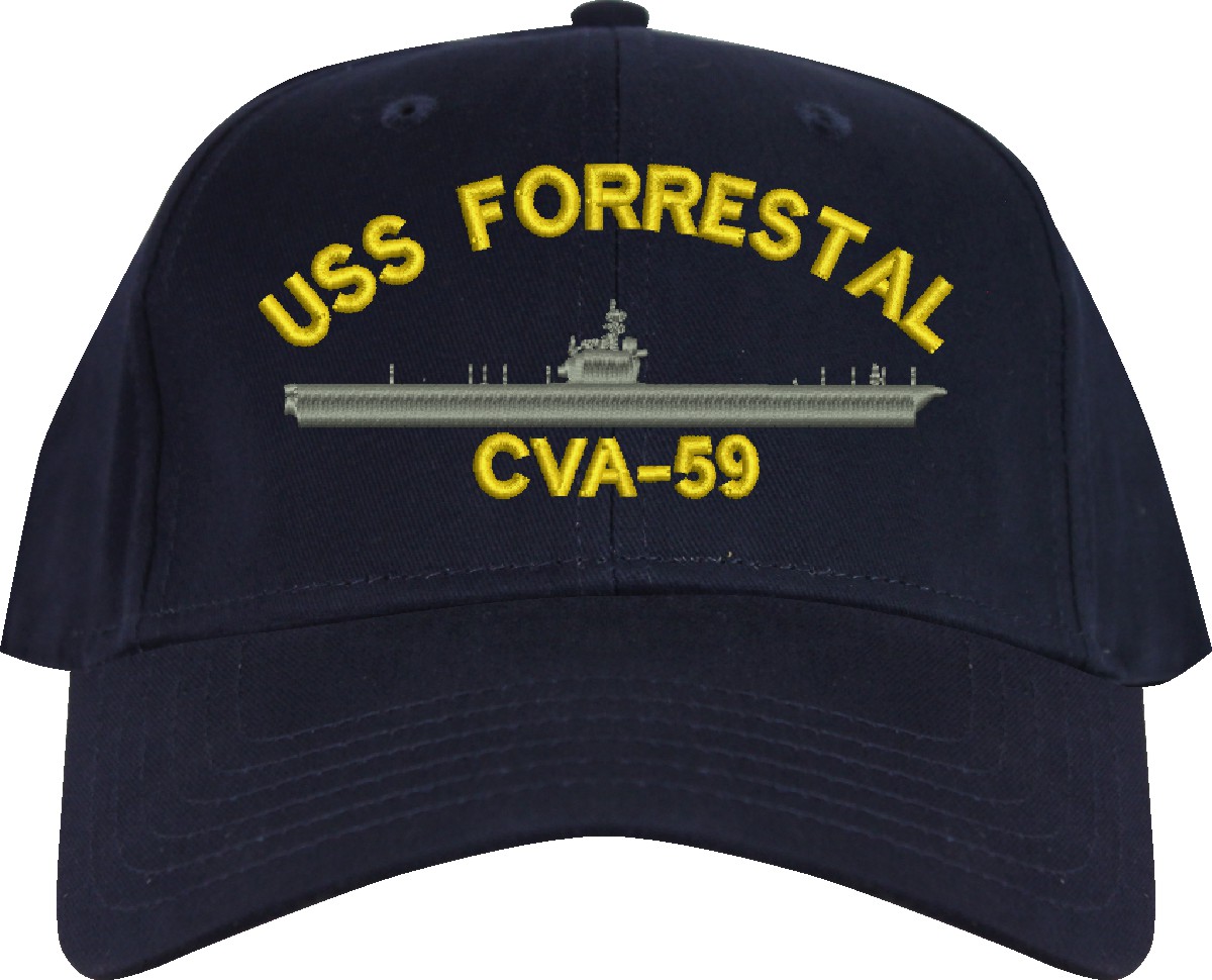 All Text on custom orders will be embroidered in ALL CAPITAL LETTERS.MilitaryBest is proud to offer this USS Forrestal CVA-59 Imported Cap. This Cap honors the service of our U.S. Navy personel who have served aboard this ship protecting our freedom with pride. Choose from an assortment of colors in High or Low Profile. These are perfect for honoring your USS Forrestal Navy Veteran. For an additional cost you can also have your Custom Text embroidered on the back of the ball cap. All embroidery is performed to order at our facilities in Scottsboro, Alabama by Americans with a passion for patriotism!