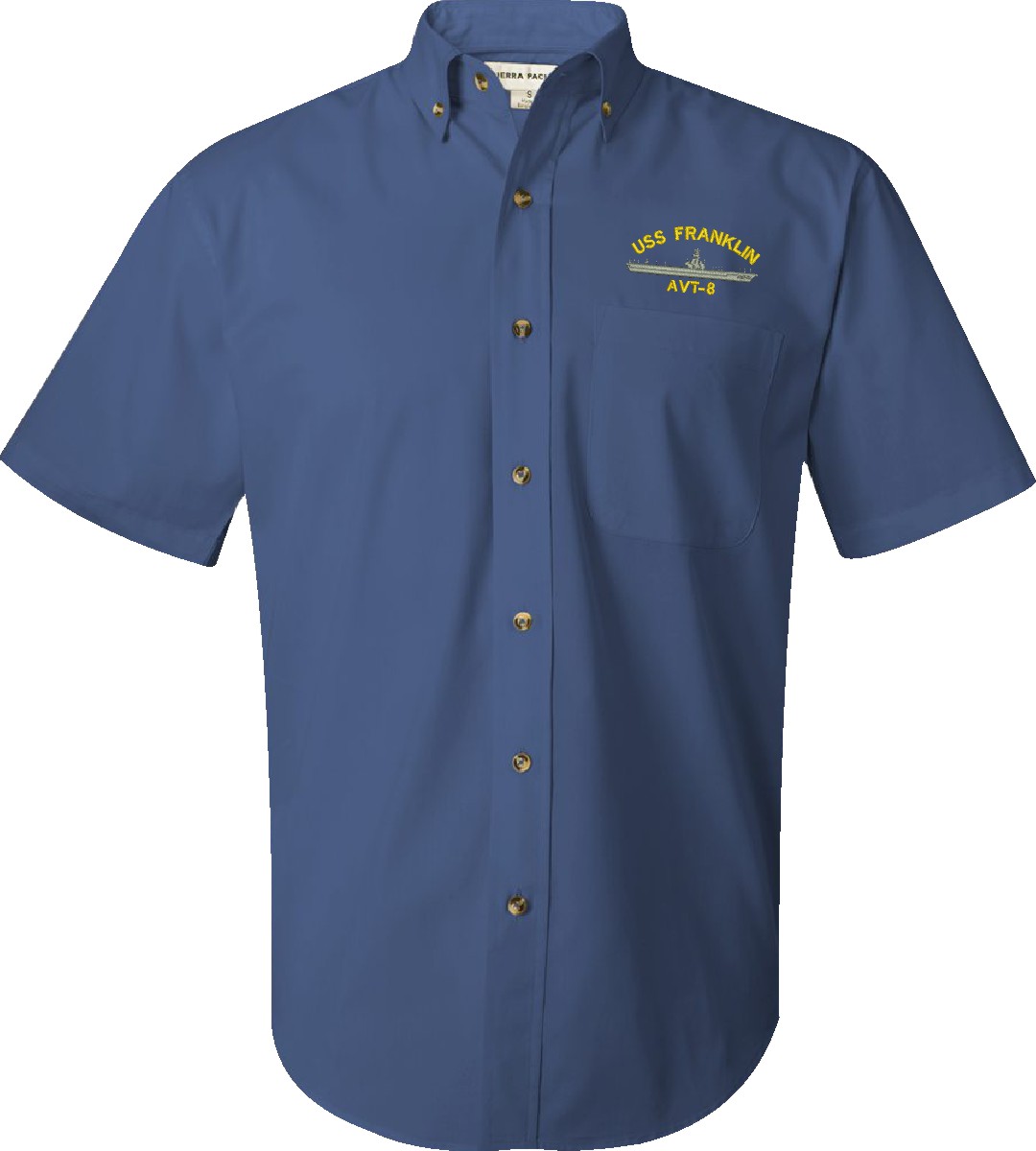 MilitaryBest is proud to offer this USS Franklin AVT-8 Featherlite Button Down Shirt. This Short Sleeve Dress shirt honors the service of our U.S. Navy personel who have served aboard this ship protecting our freedom with pride. Choose from an assortment of colors in sizes Small through 3XL. These are perfect for honoring your USS Franklin Navy Veteran. For an additional cost you can also have your Rank & Rate embroidered on the left sleeve of the shirt. All embroidery is performed to order at our facilities in Scottsboro, Alabama by Americans with a passion for patriotism!