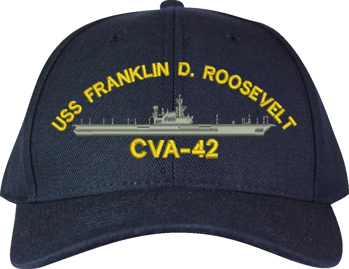 MilitaryBest is proud to offer this USS Franklin D. Roosevelt CVA-42 Made in the USA Ball Cap. This Cap honors the service of our U.S. Navy personel who have served aboard this ship protecting our freedom with pride. Choose from Navy Blue or Black in High or Low Profile. These are perfect for honoring your USS Franklin D. Roosevelt Navy Veteran. For an additional cost you can also have your Custom Text embroidered on the back of the ball cap. Embroidery on these Made in the USA caps is performed to order at our facilities in Scottsboro, Alabama by Americans with a passion for patriotism!