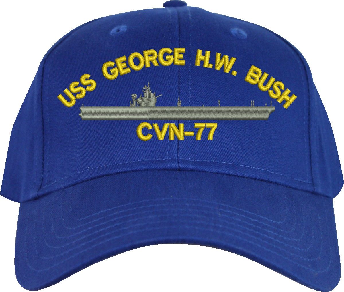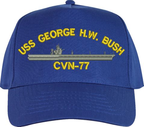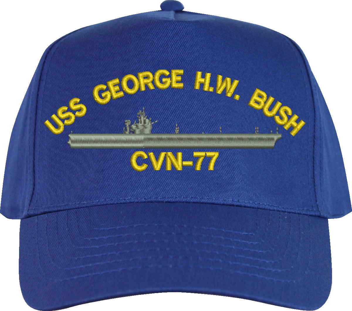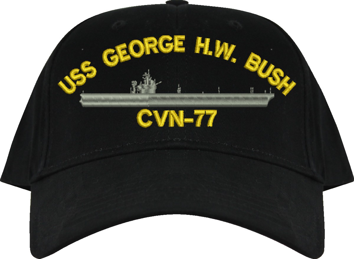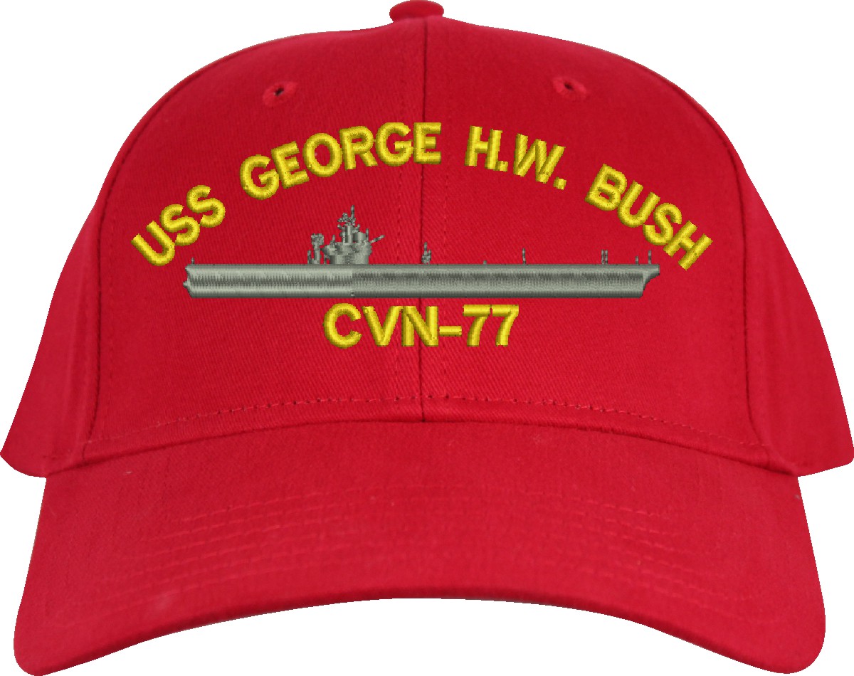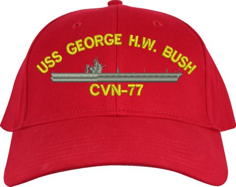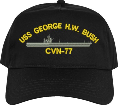 All Text on custom orders will be embroidered in ALL CAPITAL LETTERS.MilitaryBest is proud to offer this USS George H.W. Bush CVN-77 Imported Cap. This Cap honors the service of our U.S. Navy personel who have served aboard this ship protecting our freedom with pride. Choose from an assortment of colors in High or Low Profile. These are perfect for honoring your USS George H.W. Bush Navy Veteran. For an additional cost you can also have your Custom Text embroidered on the back of the ball cap. All embroidery is performed to order at our facilities in Scottsboro, Alabama by Americans with a passion for patriotism!