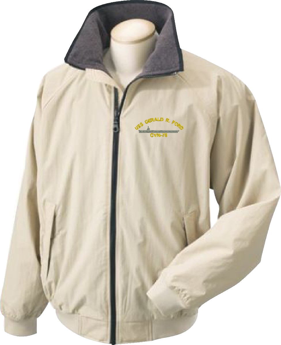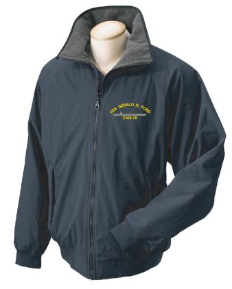 Note: Some of the Color Options pictured may not be available. Available Color Options are listed on the drop down menu above.All Text on custom orders will be embroidered in ALL CAPITAL LETTERS.MilitaryBest is expanding it's line of Men's and Women's apparel with this quality USS Gerald R. Ford CVN-78 Jacket. This jacket is made from a 3-Layer system consisting of a nylon shell, an insulator layer, Nylon-lined sleeves, and an inside layer of fleece for comfort. The jacket features include a sturdy black enamel front-zipper, raglan sleeves, outsize zip pockets, an inside zip security pocket, YKK zippers, and a banded-bottom. This jacket will make an excellent addition to your wardrobe, or a quality gift. Your satisfaction is guaranteed! All embroidery is done at our facilities in Scottsboro, AL.