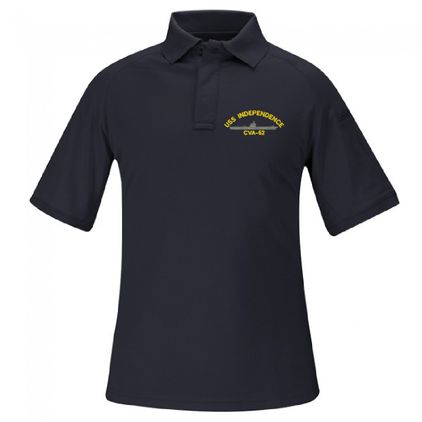 MilitaryBest is proud to offer this USS Independence CVA-62 Propper Brand Snag Free Polo Shirt. These polos are Moisture Wicking with a knit so tight that the shirt will not snag. This Polo honors the service of our U.S. Navy personel who have served aboard this ship protecting our freedom with pride. Choose from Black, Navy Blue, and White in Sizes Small - 5XL. These are perfect for honoring your USS Independence Navy Veteran. For an additional cost you can also have your Rank & Rate embroidered on the left sleeve of the Polo. All embroidery is performed to order at our facilities in Scottsboro, Alabama by Americans with a passion for patriotism!