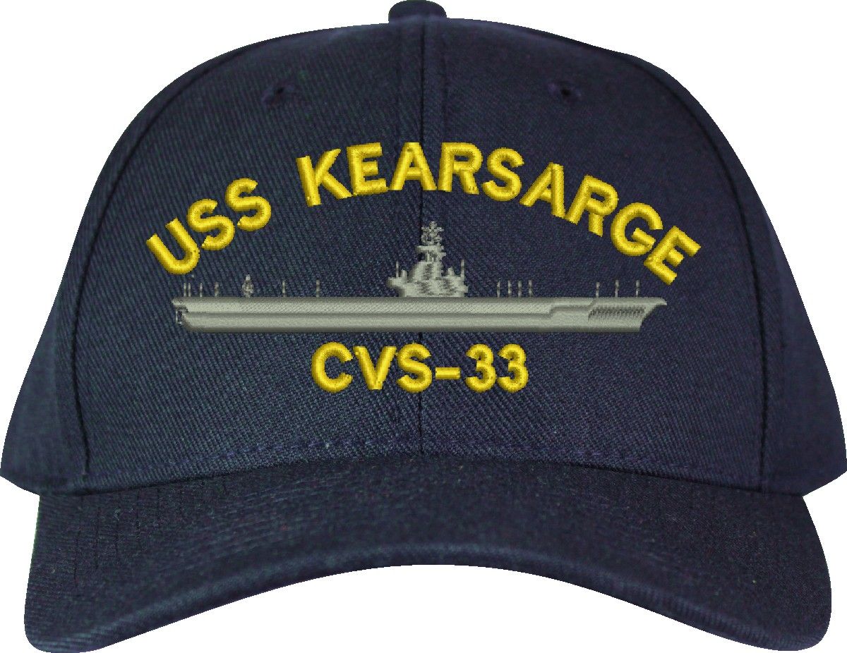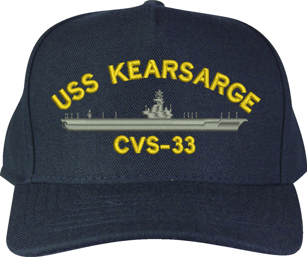 MilitaryBest is proud to offer this USS Kearsarge CVS-33 Made in the USA Ball Cap. This Cap honors the service of our U.S. Navy personel who have served aboard this ship protecting our freedom with pride. Choose from Navy Blue or Black in High or Low Profile. These are perfect for honoring your USS Kearsarge Navy Veteran. For an additional cost you can also have your Custom Text embroidered on the back of the ball cap. Embroidery on these Made in the USA caps is performed to order at our facilities in Scottsboro, Alabama by Americans with a passion for patriotism!