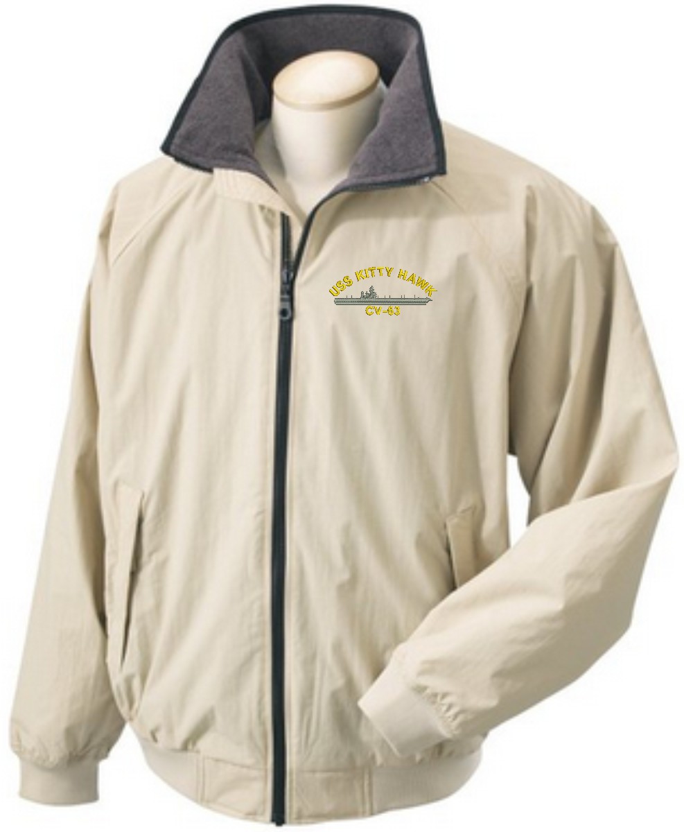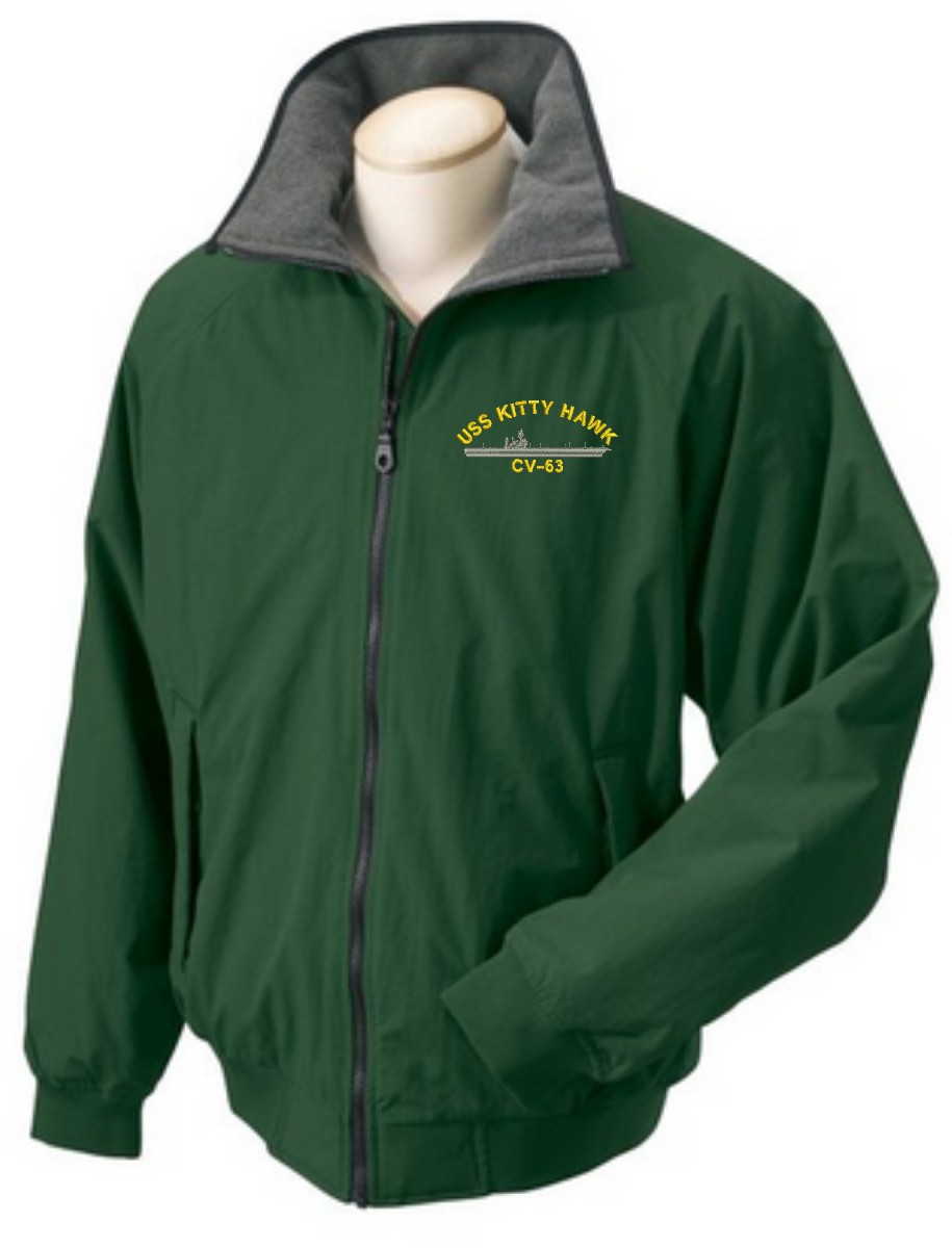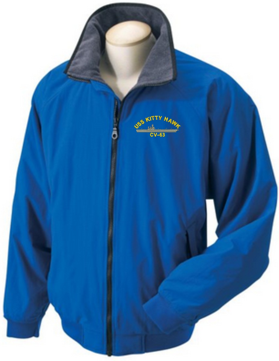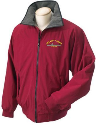 Note: Some of the Color Options pictured may not be available. Available Color Options are listed on the drop down menu above.All Text on custom orders will be embroidered in ALL CAPITAL LETTERS.MilitaryBest is expanding it's line of Men's and Women's apparel with this quality USS Kitty Hawk CV-63 Jacket. This jacket is made from a 3-Layer system consisting of a nylon shell, an insulator layer, Nylon-lined sleeves, and an inside layer of fleece for comfort. The jacket features include a sturdy black enamel front-zipper, raglan sleeves, outsize zip pockets, an inside zip security pocket, YKK zippers, and a banded-bottom. This jacket will make an excellent addition to your wardrobe, or a quality gift. Your satisfaction is guaranteed! All embroidery is done at our facilities in Scottsboro, AL.