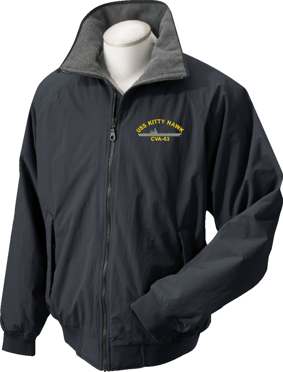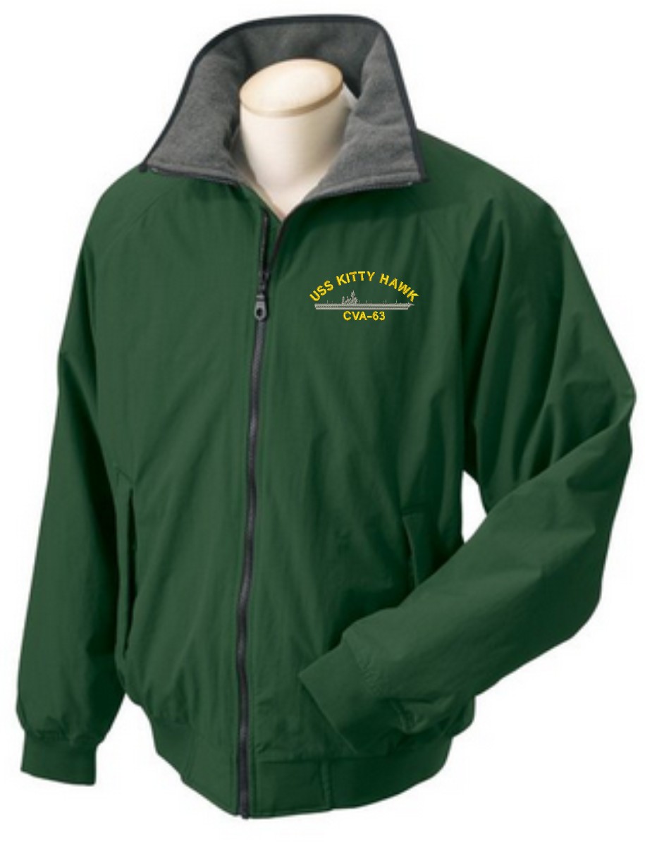 Note: Some of the Color Options pictured may not be available. Available Color Options are listed on the drop down menu above.All Text on custom orders will be embroidered in ALL CAPITAL LETTERS.MilitaryBest is expanding it's line of Men's and Women's apparel with this quality USS Kitty Hawk CVA-63 Jacket. This jacket is made from a 3-Layer system consisting of a nylon shell, an insulator layer, Nylon-lined sleeves, and an inside layer of fleece for comfort. The jacket features include a sturdy black enamel front-zipper, raglan sleeves, outsize zip pockets, an inside zip security pocket, YKK zippers, and a banded-bottom. This jacket will make an excellent addition to your wardrobe, or a quality gift. Your satisfaction is guaranteed! All embroidery is done at our facilities in Scottsboro, AL.