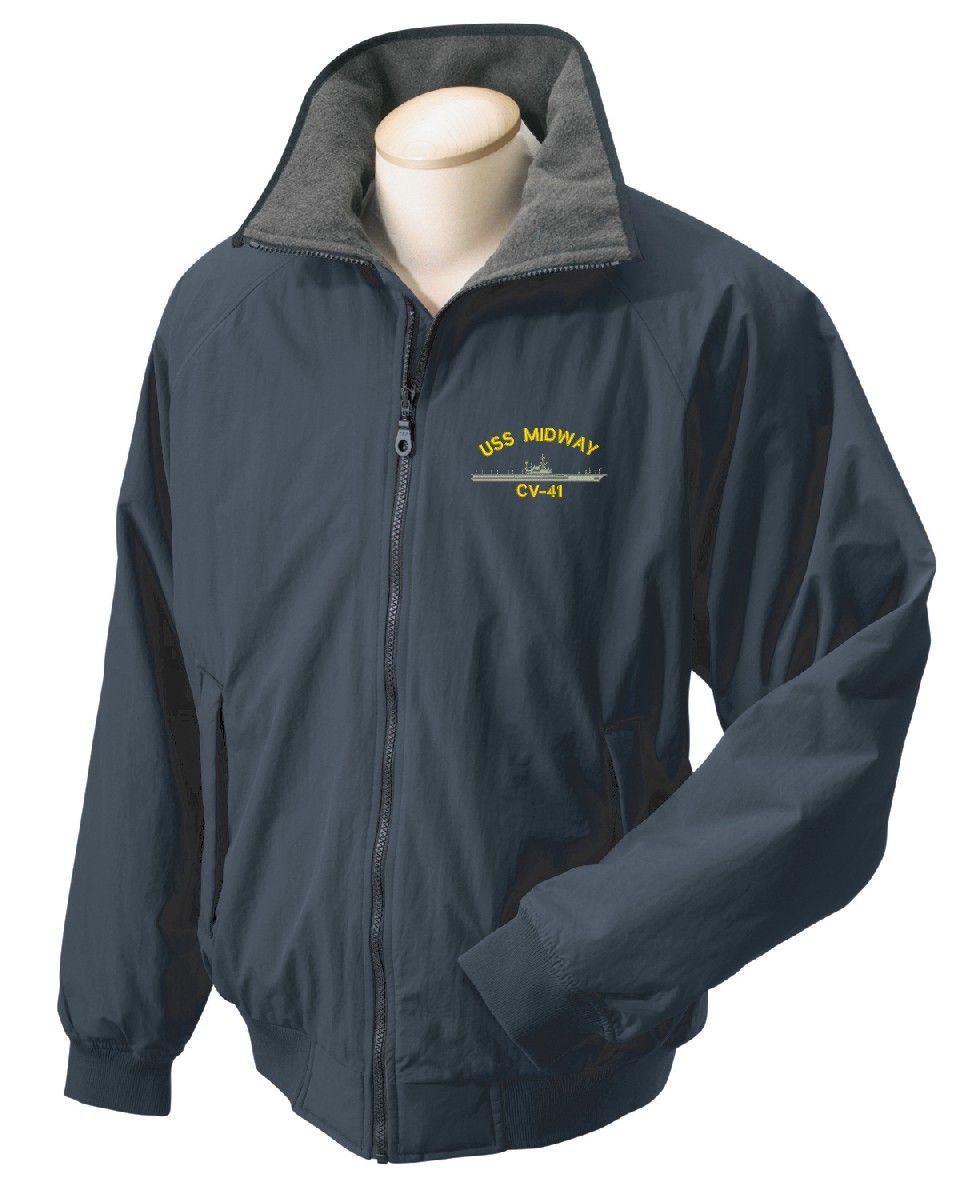 Note: Some of the Color Options pictured may not be available. Available Color Options are listed on the drop down menu above.All Text on custom orders will be embroidered in ALL CAPITAL LETTERS.MilitaryBest is expanding it's line of Men's and Women's apparel with this quality USS Midway CV-41 Jacket. This jacket is made from a 3-Layer system consisting of a nylon shell, an insulator layer, Nylon-lined sleeves, and an inside layer of fleece for comfort. The jacket features include a sturdy black enamel front-zipper, raglan sleeves, outsize zip pockets, an inside zip security pocket, YKK zippers, and a banded-bottom. This jacket will make an excellent addition to your wardrobe, or a quality gift. Your satisfaction is guaranteed! All embroidery is done at our facilities in Scottsboro, AL.