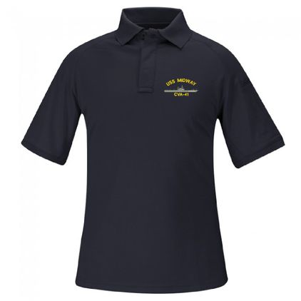 MilitaryBest is proud to offer this USS Midway CVA-41 Propper Brand Snag Free Polo Shirt. These polos are Moisture Wicking with a knit so tight that the shirt will not snag. This Polo honors the service of our U.S. Navy personel who have served aboard this ship protecting our freedom with pride. Choose from Black, Navy Blue, and White in Sizes Small - 5XL. These are perfect for honoring your USS Midway Navy Veteran. For an additional cost you can also have your Rank & Rate embroidered on the left sleeve of the Polo. All embroidery is performed to order at our facilities in Scottsboro, Alabama by Americans with a passion for patriotism!