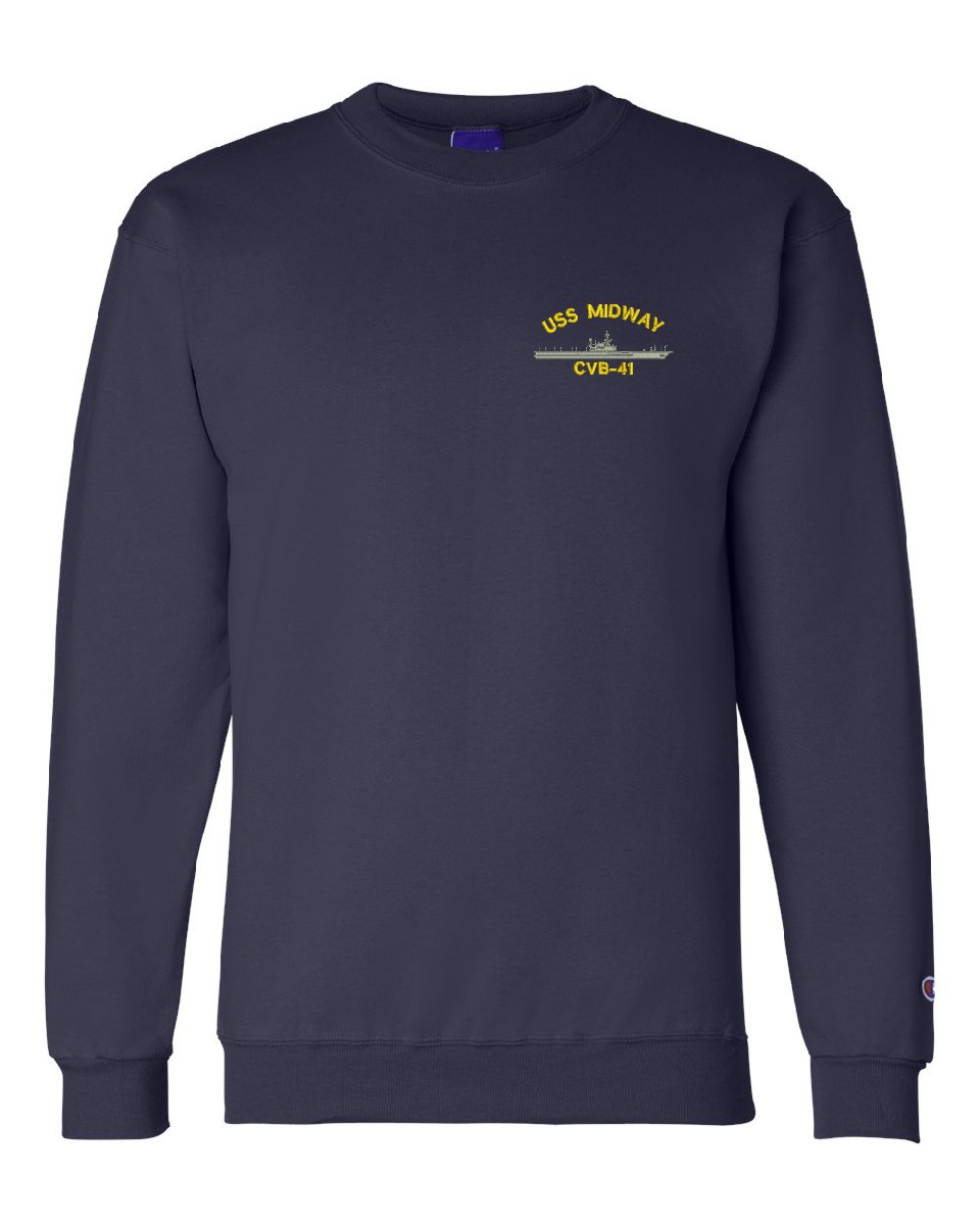 MilitaryBest is proud to offer this USS Midway CVB-41 Sweatshirt. This Sweatshirt honors the service of our U.S. Navy personel who have served aboard this ship protecting our freedom with pride. Choose from an assortment of colors in sizes Small through 3XL. These are perfect for honoring your USS Midway Navy Veteran. For an additional cost you can also have your Rank & Rate embroidered on the left sleeve of the Sweatshirt. All embroidery is performed to order at our facilities in Scottsboro, Alabama by Americans with a passion for patriotism!