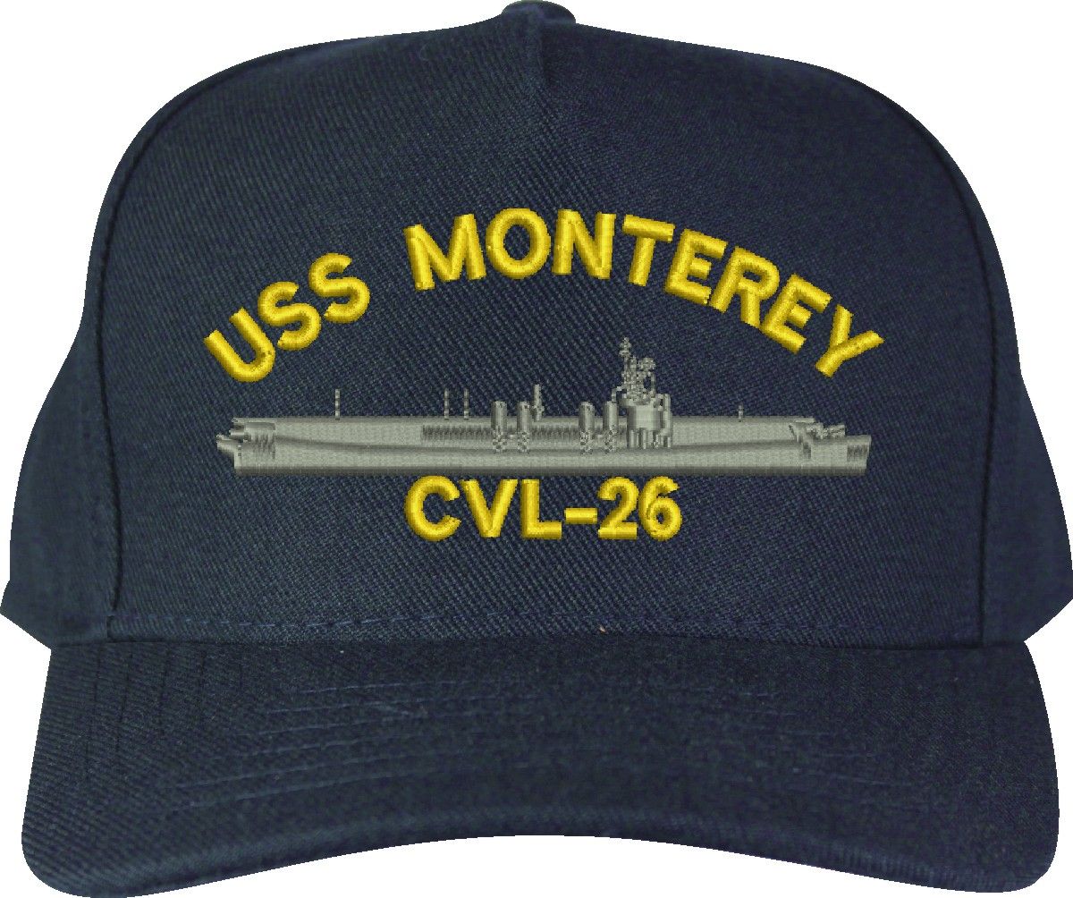 MilitaryBest is proud to offer this USS Monterey CVL-26 Made in the USA Ball Cap. This Cap honors the service of our U.S. Navy personel who have served aboard this ship protecting our freedom with pride. Choose from Navy Blue or Black in High or Low Profile. These are perfect for honoring your USS Monterey Navy Veteran. For an additional cost you can also have your Custom Text embroidered on the back of the ball cap. Embroidery on these Made in the USA caps is performed to order at our facilities in Scottsboro, Alabama by Americans with a passion for patriotism!