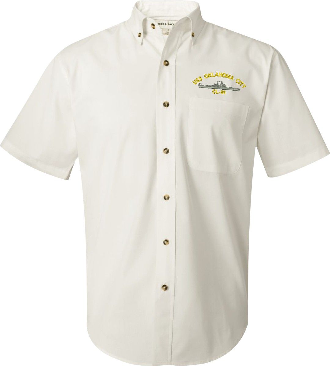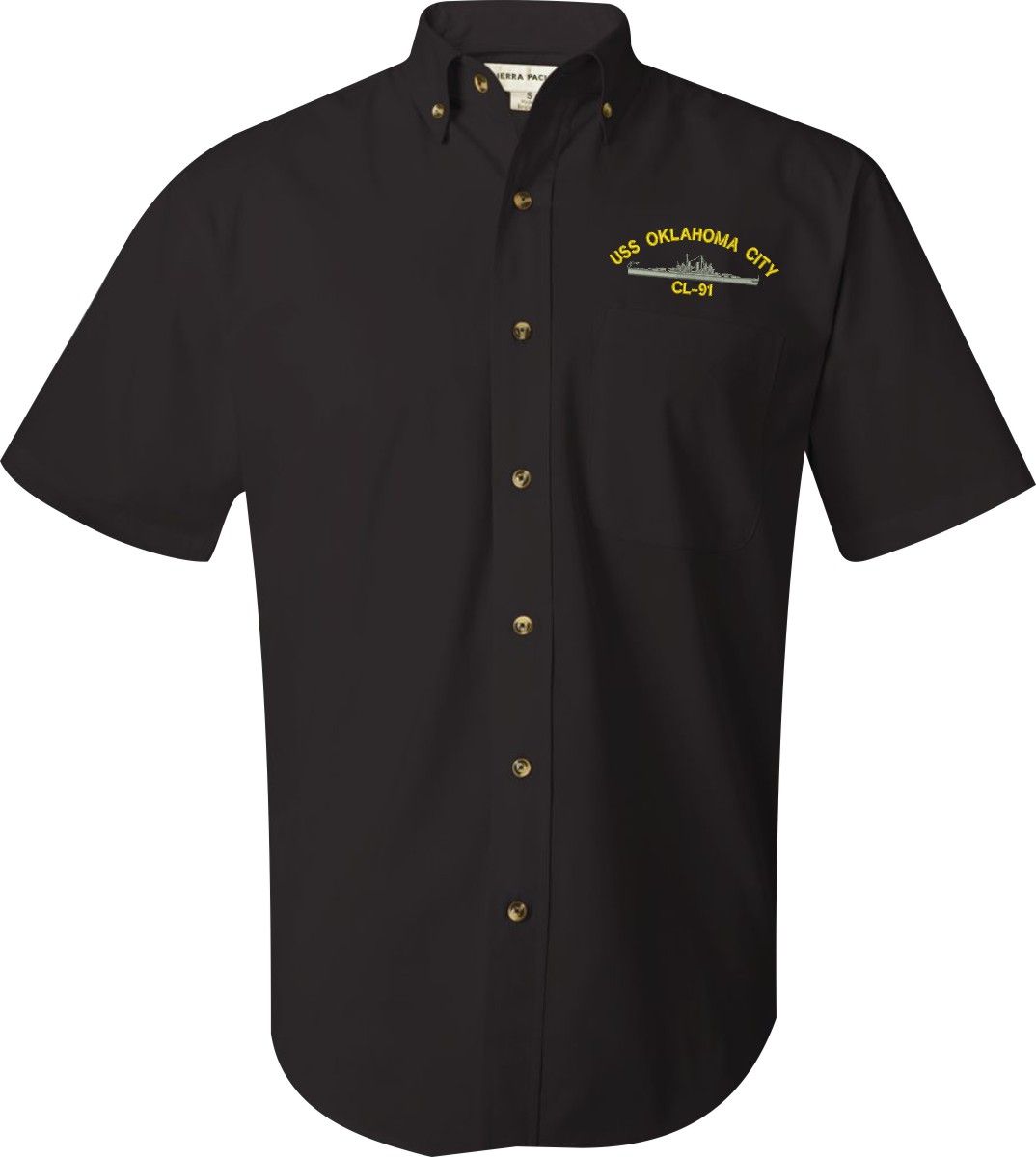 MilitaryBest is proud to offer this USS Oklahoma City CL-91 Featherlite Button Down Shirt. This Short Sleeve Dress shirt honors the service of our U.S. Navy personel who have served aboard this ship protecting our freedom with pride. Choose from an assortment of colors in sizes Small through 3XL. These are perfect for honoring your USS Oklahoma City Navy Veteran. For an additional cost you can also have your Rank & Rate embroidered on the left sleeve of the shirt. All embroidery is performed to order at our facilities in Scottsboro, Alabama by Americans with a passion for patriotism!