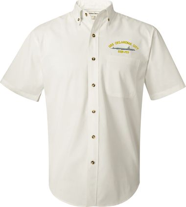 MilitaryBest is proud to offer this USS Oklahoma City SSN-723 Featherlite Button Down Shirt. This Short Sleeve Dress shirt honors the service of our U.S. Navy personel who have served aboard this ship protecting our freedom with pride. Choose from an assortment of colors in sizes Small through 3XL. These are perfect for honoring your USS Oklahoma City Navy Veteran. For an additional cost you can also have your Rank & Rate embroidered on the left sleeve of the shirt. All embroidery is performed to order at our facilities in Scottsboro, Alabama by Americans with a passion for patriotism!