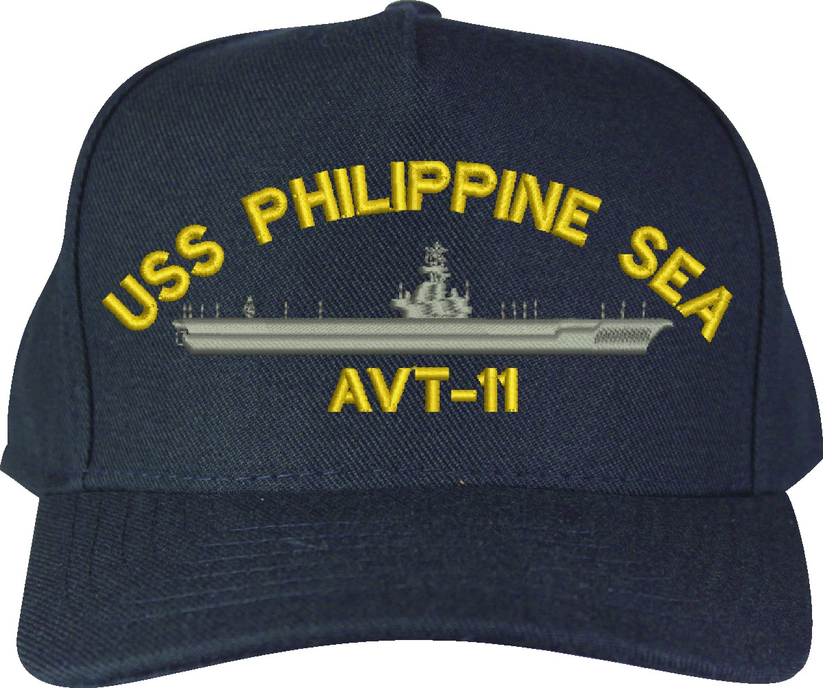 MilitaryBest is proud to offer this USS Philippine Sea AVT-11 Made in the USA Ball Cap. This Cap honors the service of our U.S. Navy personel who have served aboard this ship protecting our freedom with pride. Choose from Navy Blue or Black in High or Low Profile. These are perfect for honoring your USS Philippine Sea Navy Veteran. For an additional cost you can also have your Custom Text embroidered on the back of the ball cap. Embroidery on these Made in the USA caps is performed to order at our facilities in Scottsboro, Alabama by Americans with a passion for patriotism!