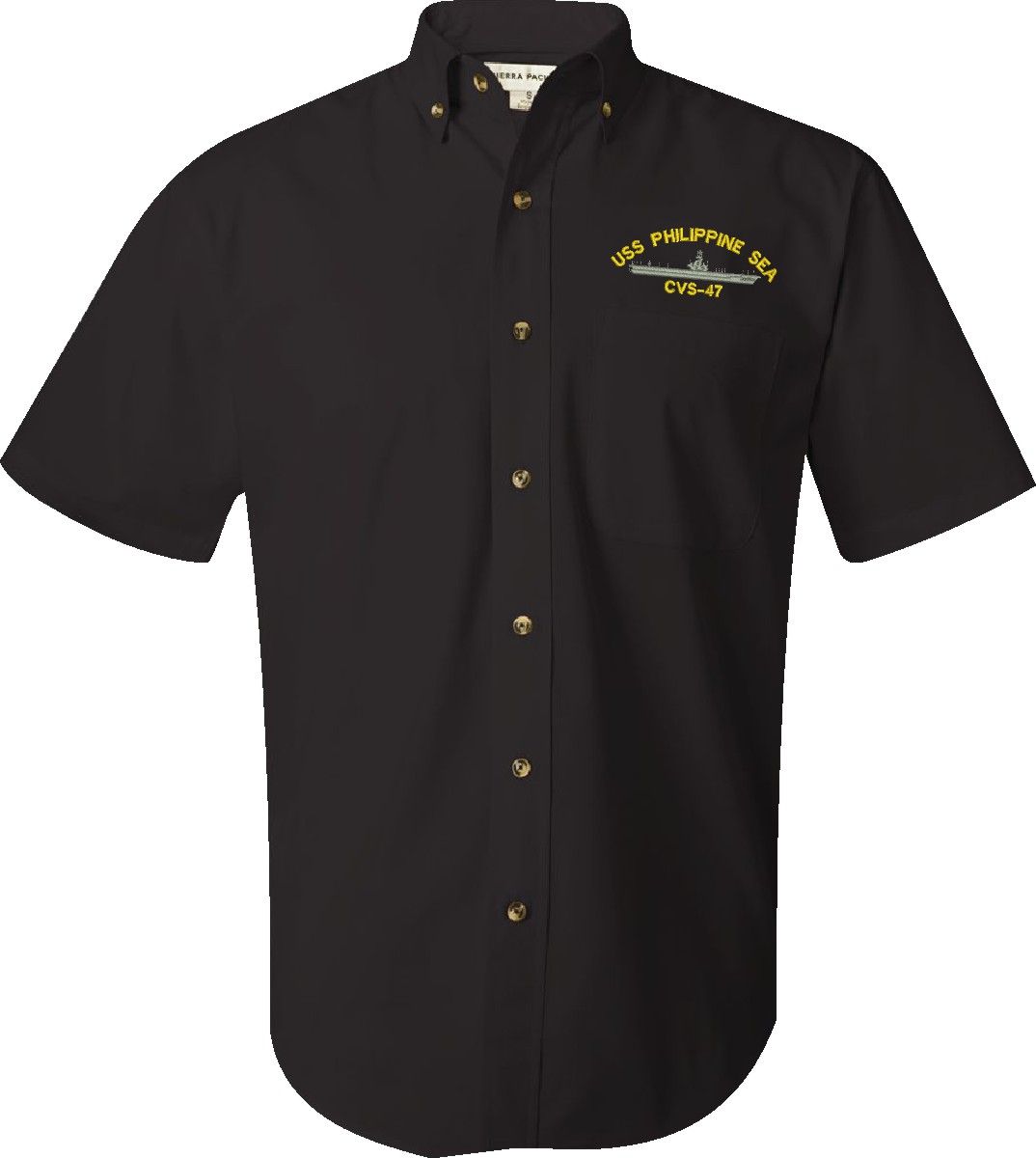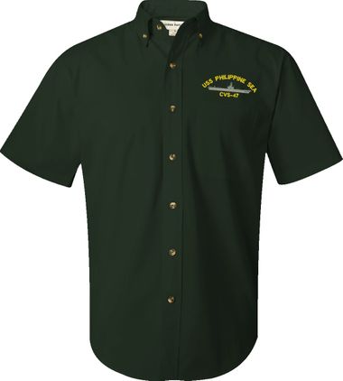 MilitaryBest is proud to offer this USS Philippine Sea CVS-47 Featherlite Button Down Shirt. This Short Sleeve Dress shirt honors the service of our U.S. Navy personel who have served aboard this ship protecting our freedom with pride. Choose from an assortment of colors in sizes Small through 3XL. These are perfect for honoring your USS Philippine Sea Navy Veteran. For an additional cost you can also have your Rank & Rate embroidered on the left sleeve of the shirt. All embroidery is performed to order at our facilities in Scottsboro, Alabama by Americans with a passion for patriotism!