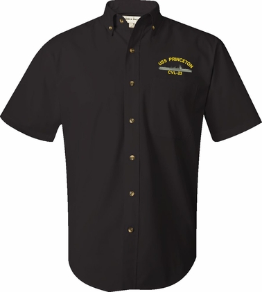 MilitaryBest is proud to offer this USS Princeton CVL-23 Featherlite Button Down Shirt. This Short Sleeve Dress shirt honors the service of our U.S. Navy personel who have served aboard this ship protecting our freedom with pride. Choose from an assortment of colors in sizes Small through 3XL. These are perfect for honoring your USS Princeton Navy Veteran. For an additional cost you can also have your Rank & Rate embroidered on the left sleeve of the shirt. All embroidery is performed to order at our facilities in Scottsboro, Alabama by Americans with a passion for patriotism!