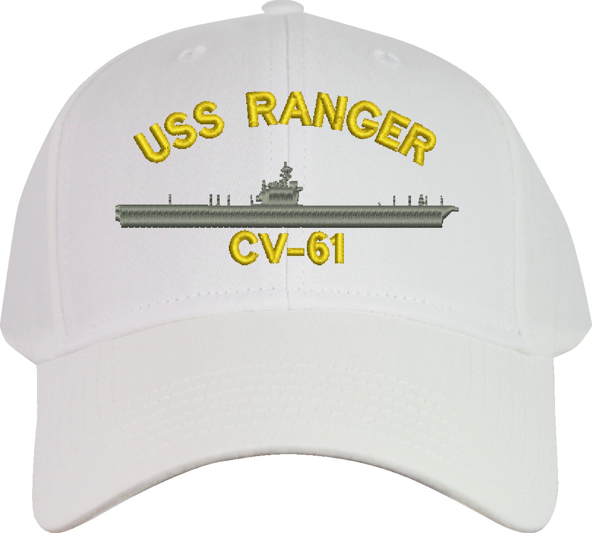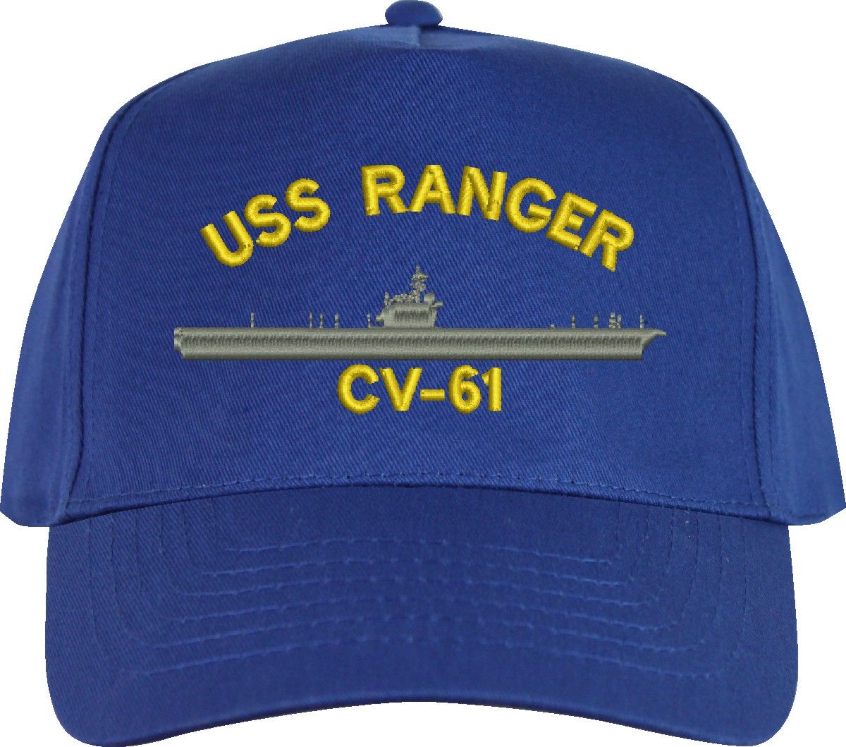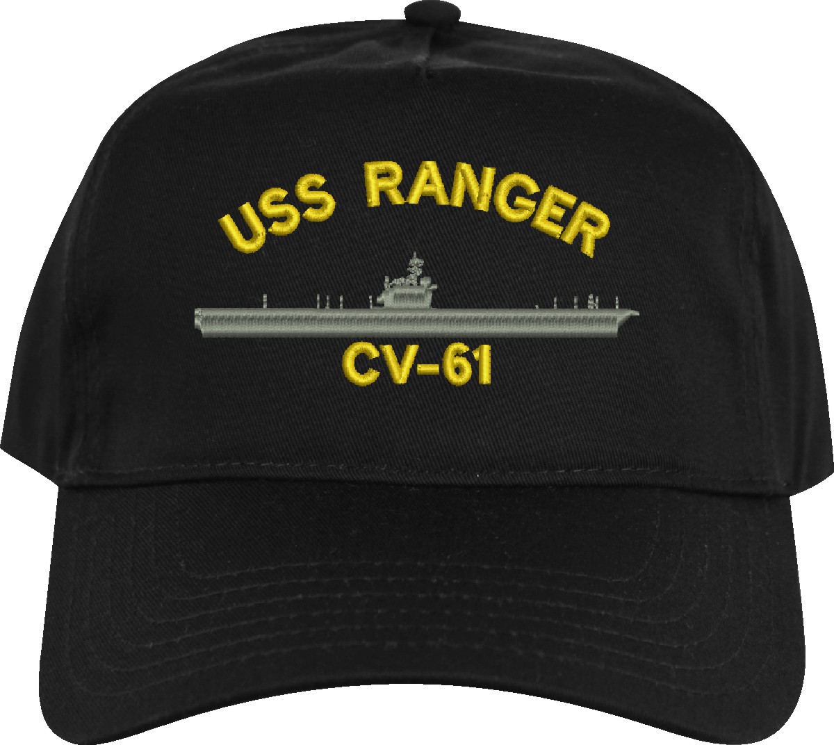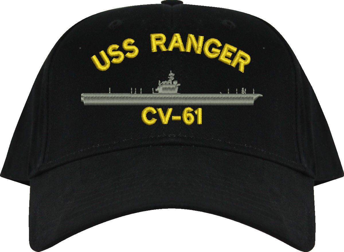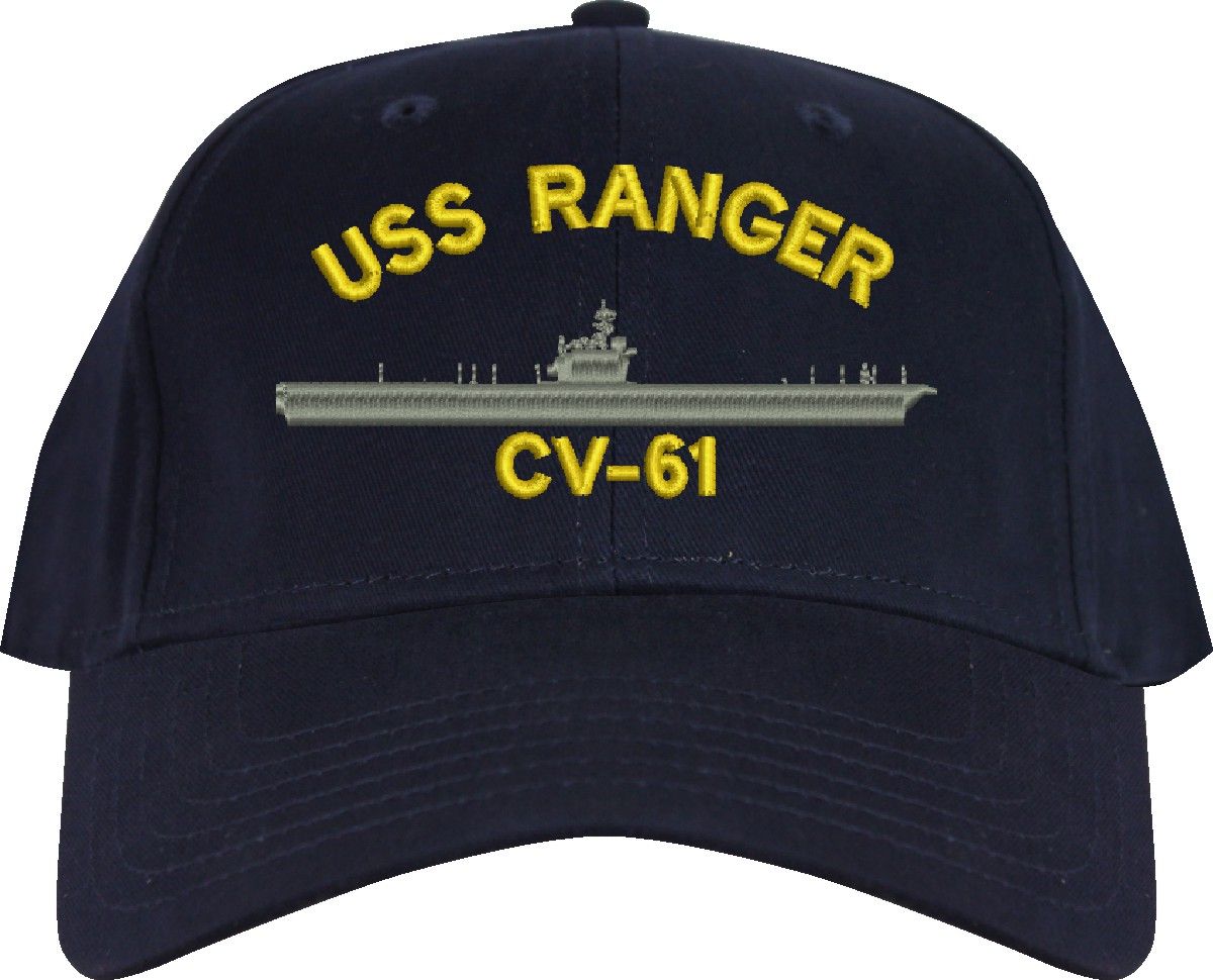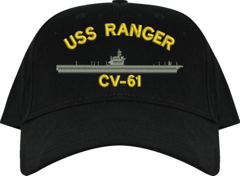 All Text on custom orders will be embroidered in ALL CAPITAL LETTERS.MilitaryBest is proud to offer this USS Ranger CV-61 Imported Cap. This Cap honors the service of our U.S. Navy personel who have served aboard this ship protecting our freedom with pride. Choose from an assortment of colors in High or Low Profile. These are perfect for honoring your USS Ranger Navy Veteran. For an additional cost you can also have your Custom Text embroidered on the back of the ball cap. All embroidery is performed to order at our facilities in Scottsboro, Alabama by Americans with a passion for patriotism!