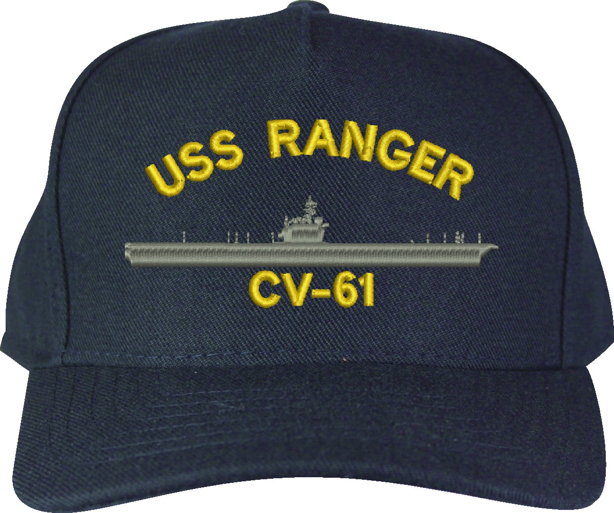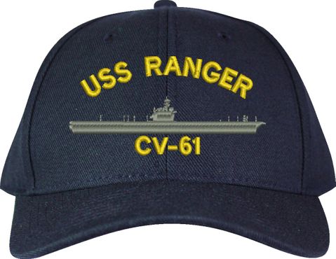 MilitaryBest is proud to offer this USS Ranger CV-61 Made in the USA Ball Cap. This Cap honors the service of our U.S. Navy personel who have served aboard this ship protecting our freedom with pride. Choose from Navy Blue or Black in High or Low Profile. These are perfect for honoring your USS Ranger Navy Veteran. For an additional cost you can also have your Custom Text embroidered on the back of the ball cap. Embroidery on these Made in the USA caps is performed to order at our facilities in Scottsboro, Alabama by Americans with a passion for patriotism!