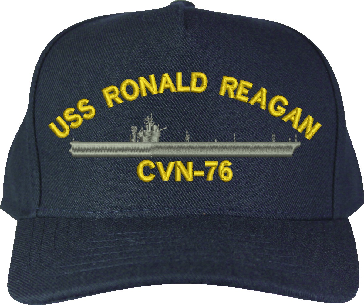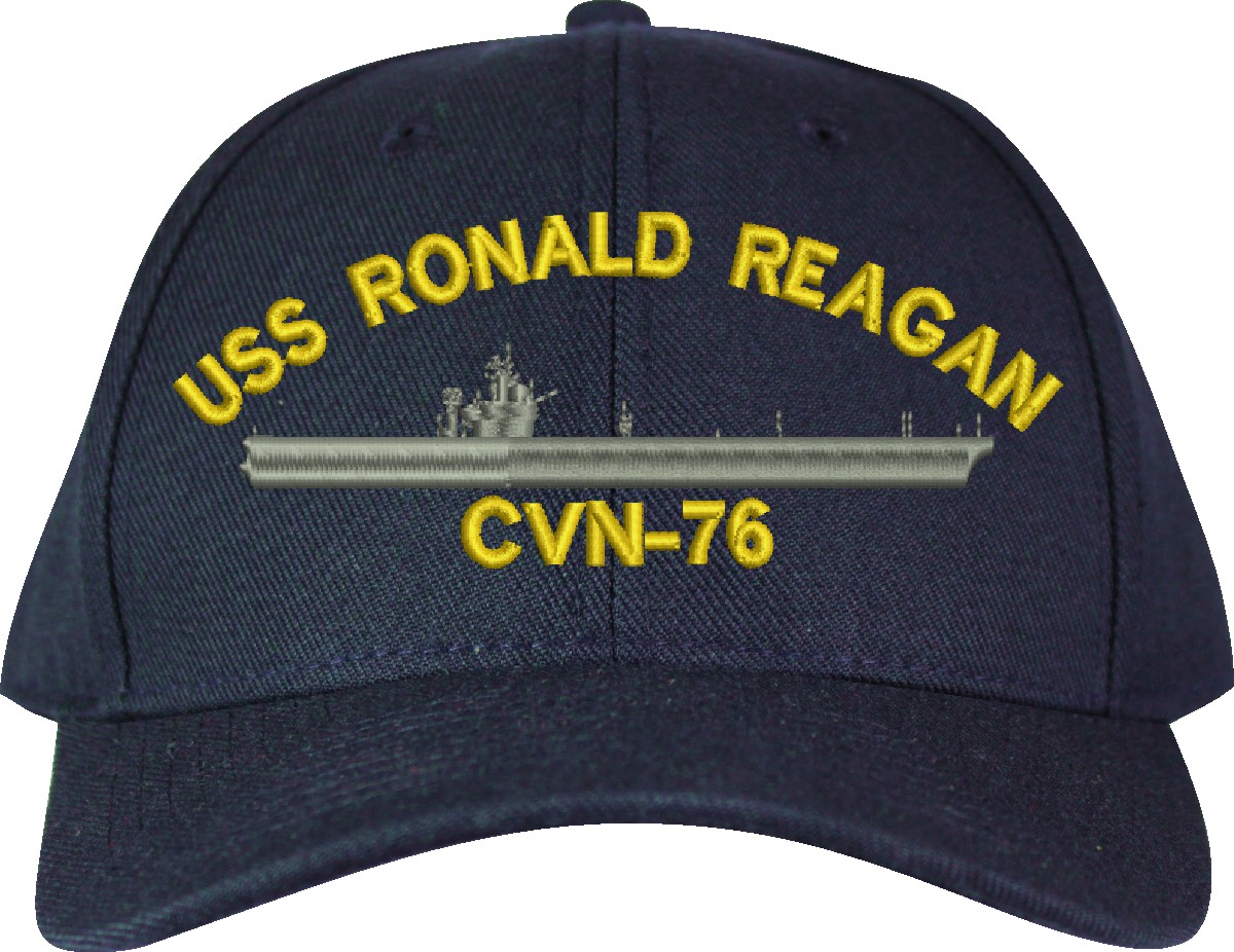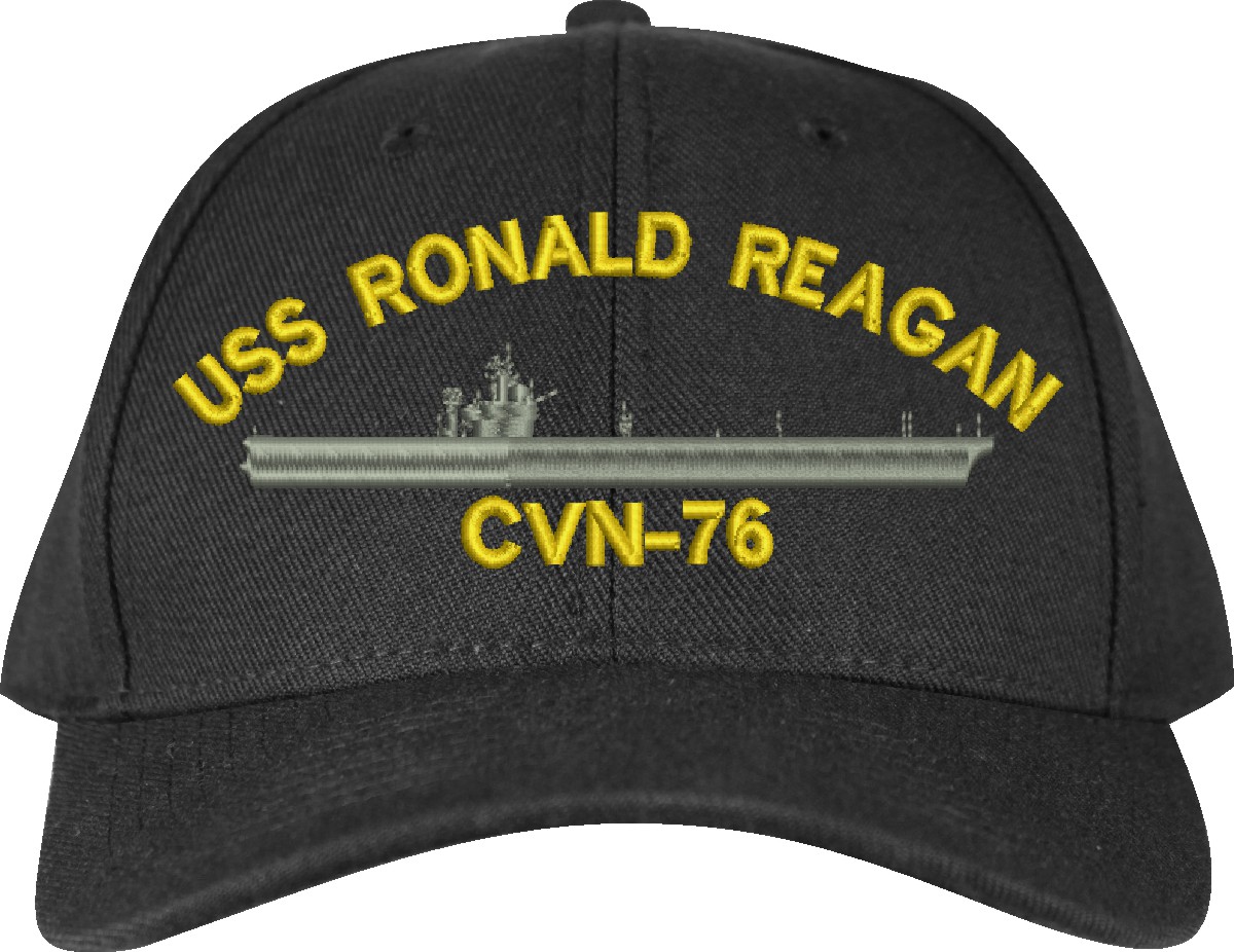 MilitaryBest is proud to offer this USS Ronald Reagan CVN-76 Made in the USA Ball Cap. This Cap honors the service of our U.S. Navy personel who have served aboard this ship protecting our freedom with pride. Choose from Navy Blue or Black in High or Low Profile. These are perfect for honoring your USS Ronald Reagan Navy Veteran. For an additional cost you can also have your Custom Text embroidered on the back of the ball cap. Embroidery on these Made in the USA caps is performed to order at our facilities in Scottsboro, Alabama by Americans with a passion for patriotism!