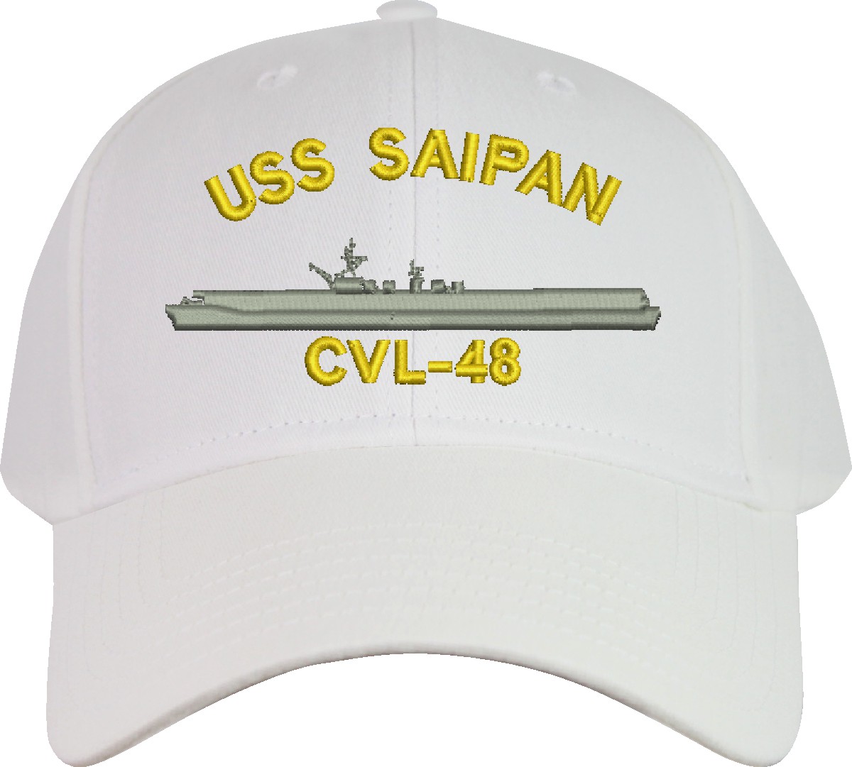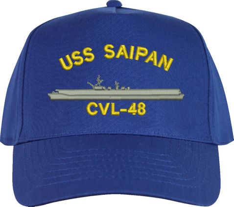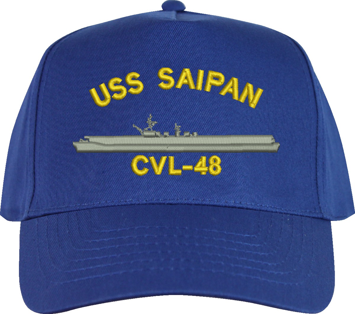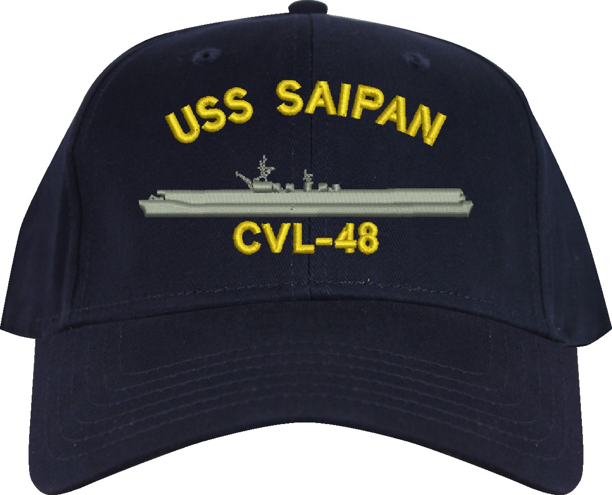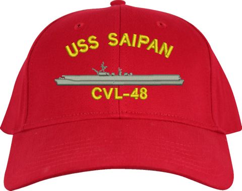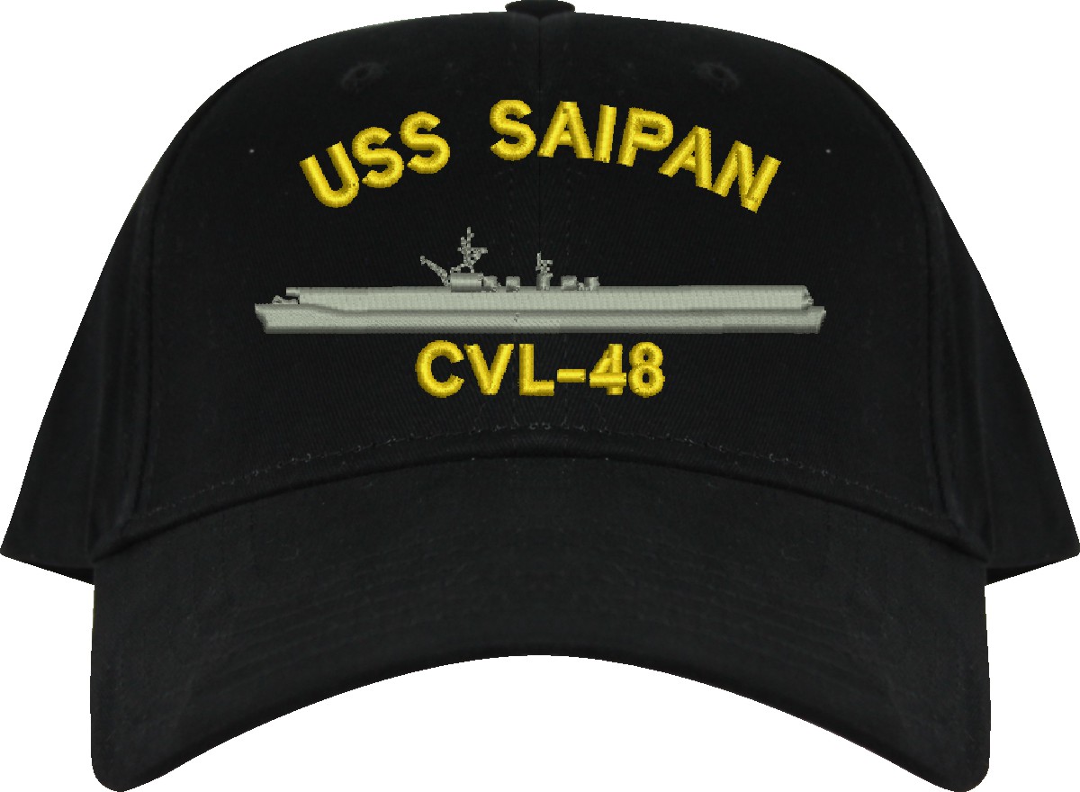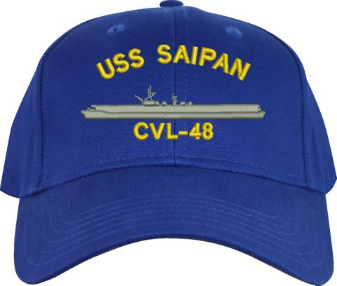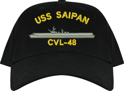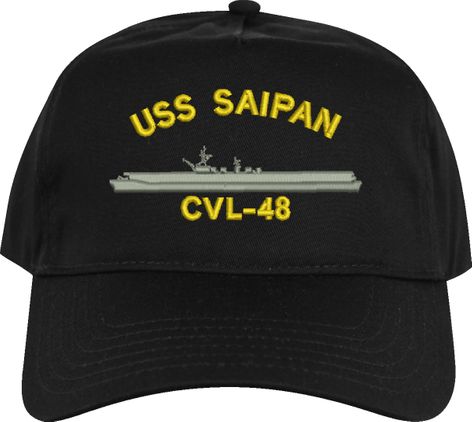 All Text on custom orders will be embroidered in ALL CAPITAL LETTERS.MilitaryBest is proud to offer this USS Saipan CVL-48 Imported Cap. This Cap honors the service of our U.S. Navy personel who have served aboard this ship protecting our freedom with pride. Choose from an assortment of colors in High or Low Profile. These are perfect for honoring your USS Saipan Navy Veteran. For an additional cost you can also have your Custom Text embroidered on the back of the ball cap. All embroidery is performed to order at our facilities in Scottsboro, Alabama by Americans with a passion for patriotism!