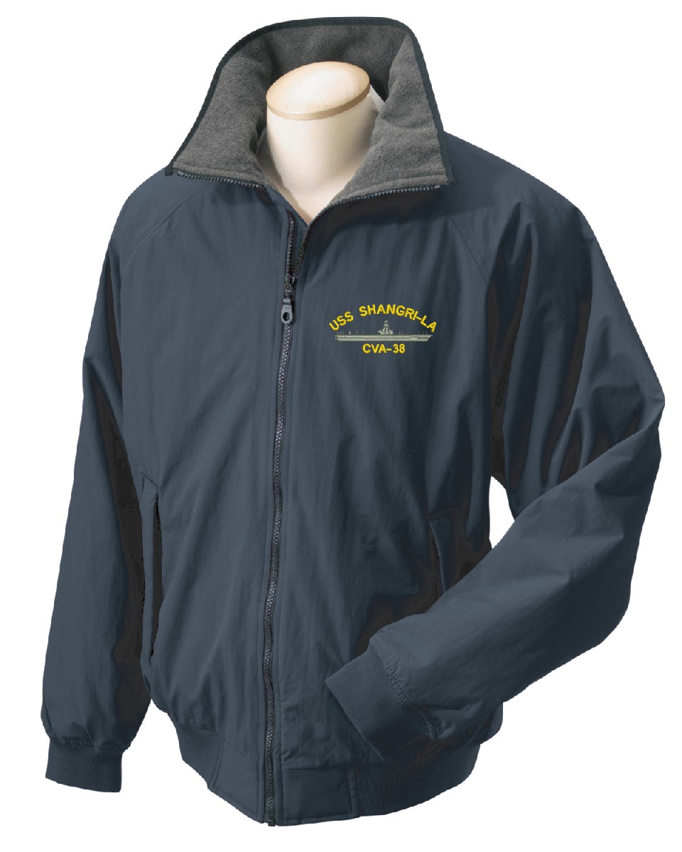 Note: Some of the Color Options pictured may not be available. Available Color Options are listed on the drop down menu above.All Text on custom orders will be embroidered in ALL CAPITAL LETTERS.MilitaryBest is expanding it's line of Men's and Women's apparel with this quality USS Shangri La CVA-38 Jacket. This jacket is made from a 3-Layer system consisting of a nylon shell, an insulator layer, Nylon-lined sleeves, and an inside layer of fleece for comfort. The jacket features include a sturdy black enamel front-zipper, raglan sleeves, outsize zip pockets, an inside zip security pocket, YKK zippers, and a banded-bottom. This jacket will make an excellent addition to your wardrobe, or a quality gift. Your satisfaction is guaranteed! All embroidery is done at our facilities in Scottsboro, AL.