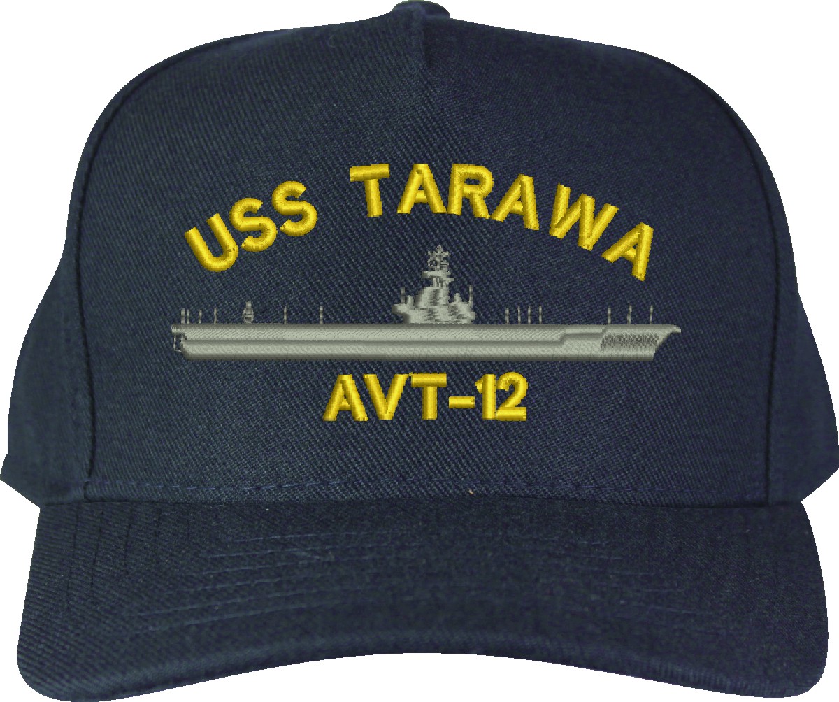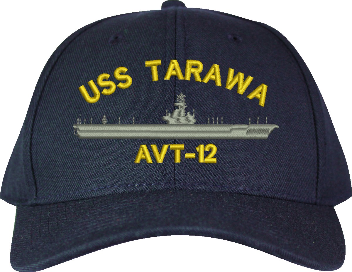 MilitaryBest is proud to offer this USS Tarawa AVT-12 Made in the USA Ball Cap. This Cap honors the service of our U.S. Navy personel who have served aboard this ship protecting our freedom with pride. Choose from Navy Blue or Black in High or Low Profile. These are perfect for honoring your USS Tarawa Navy Veteran. For an additional cost you can also have your Custom Text embroidered on the back of the ball cap. Embroidery on these Made in the USA caps is performed to order at our facilities in Scottsboro, Alabama by Americans with a passion for patriotism!