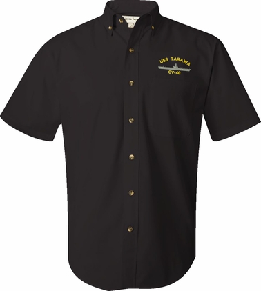 MilitaryBest is proud to offer this USS Tarawa CV-40 Featherlite Button Down Shirt. This Short Sleeve Dress shirt honors the service of our U.S. Navy personel who have served aboard this ship protecting our freedom with pride. Choose from an assortment of colors in sizes Small through 3XL. These are perfect for honoring your USS Tarawa Navy Veteran. For an additional cost you can also have your Rank & Rate embroidered on the left sleeve of the shirt. All embroidery is performed to order at our facilities in Scottsboro, Alabama by Americans with a passion for patriotism!