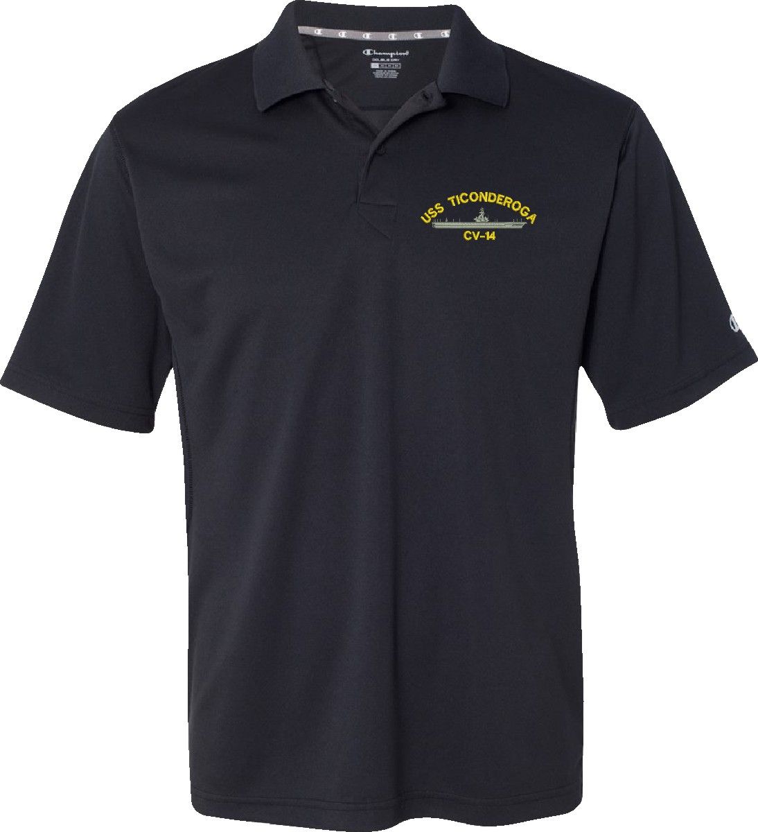 MilitaryBest is proud to offer this USS Ticonderoga CV-14 Moisture Wicking Polo. This Golf style shirt honors the service of our U.S. Navy personel who have served aboard this ship protecting our freedom with pride. Choose from an assortment of colors in sizes Small through 2XL. These are perfect for honoring your USS Ticonderoga Navy Veteran. For an additional cost you can also have your Rank & Rate embroidered on the left sleeve of the polo shirt. All embroidery is performed to order at our facilities in Scottsboro, Alabama by Americans with a passion for patriotism!