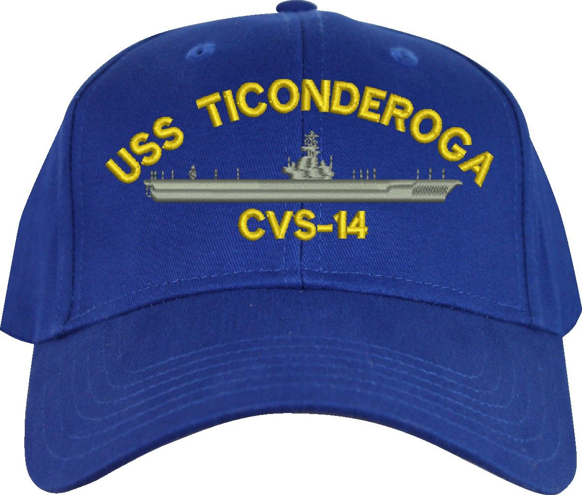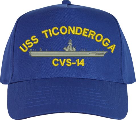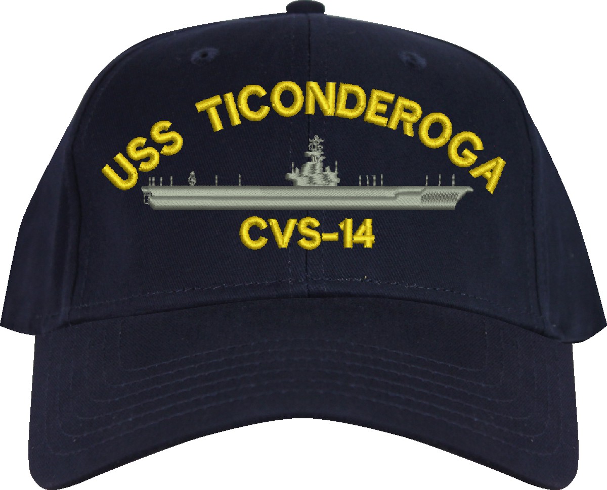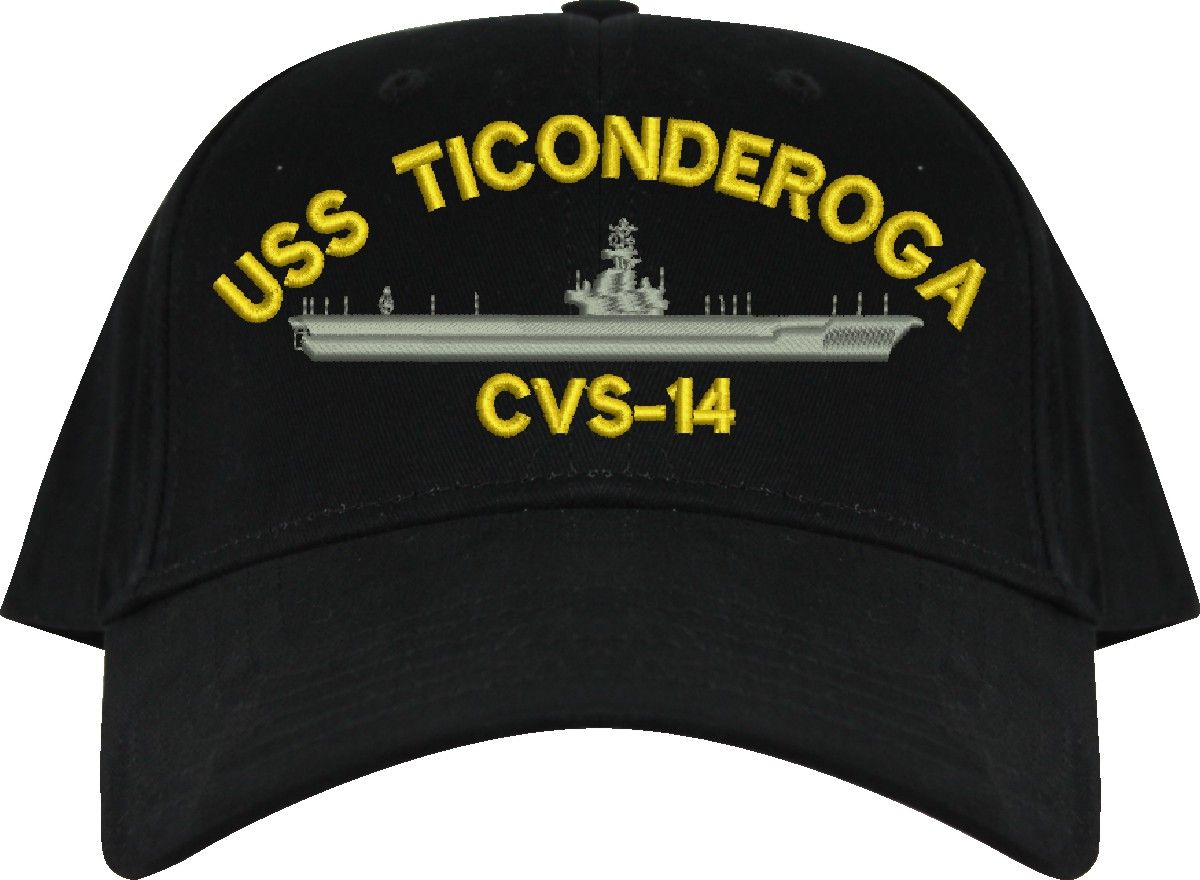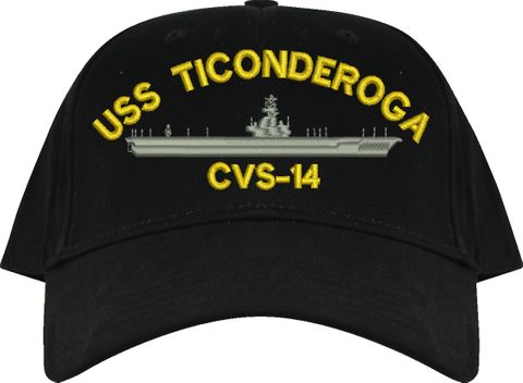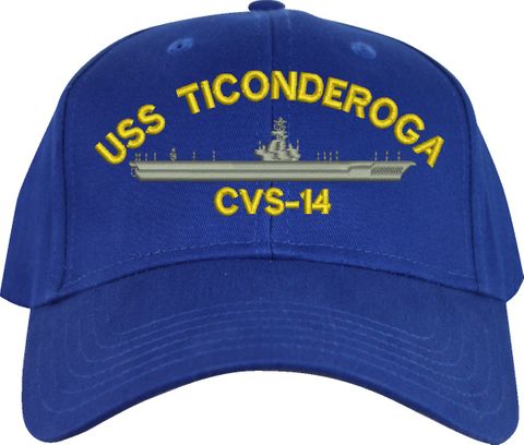 All Text on custom orders will be embroidered in ALL CAPITAL LETTERS.MilitaryBest is proud to offer this USS Ticonderoga CVS-14 Imported Cap. This Cap honors the service of our U.S. Navy personel who have served aboard this ship protecting our freedom with pride. Choose from an assortment of colors in High or Low Profile. These are perfect for honoring your USS Ticonderoga Navy Veteran. For an additional cost you can also have your Custom Text embroidered on the back of the ball cap. All embroidery is performed to order at our facilities in Scottsboro, Alabama by Americans with a passion for patriotism!