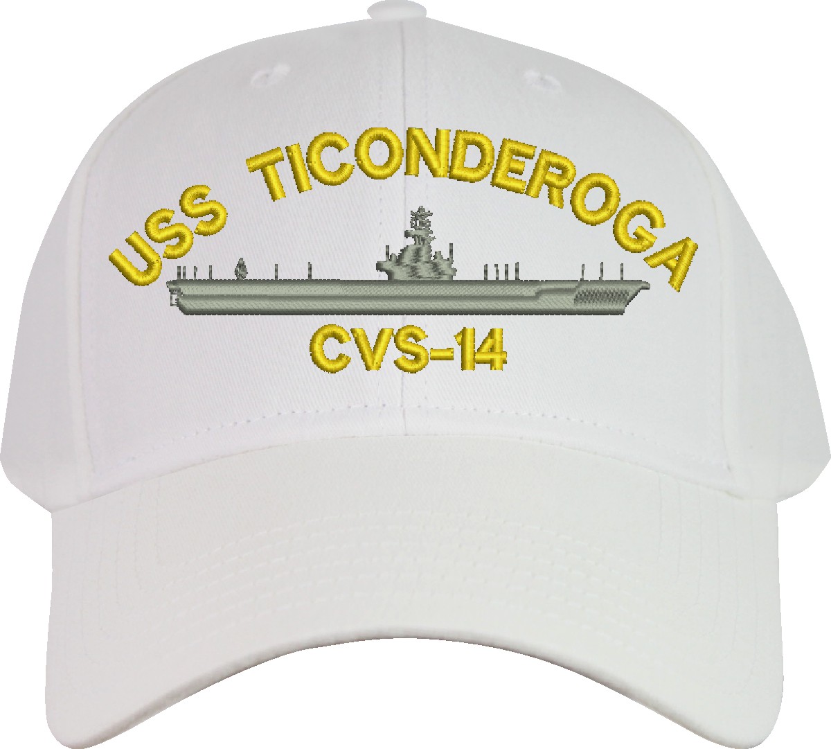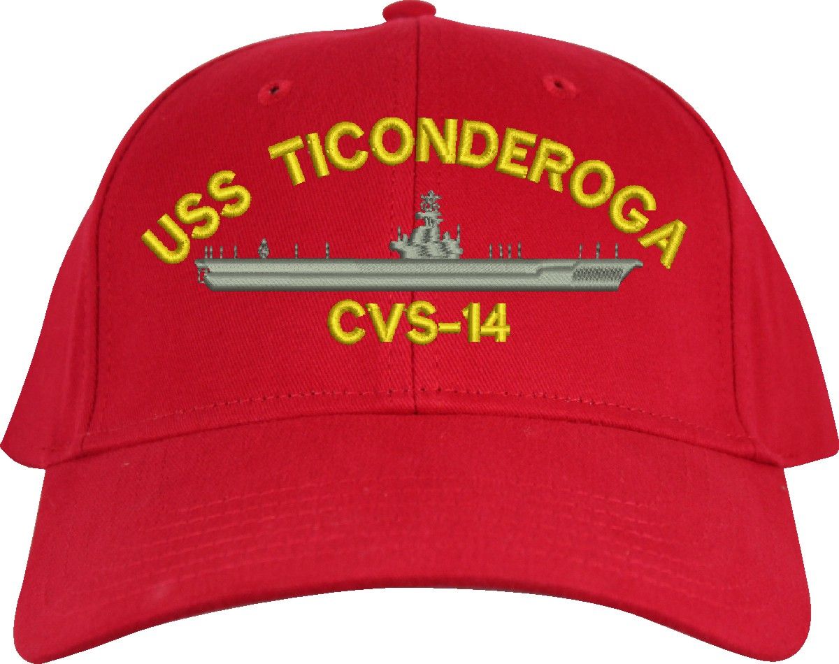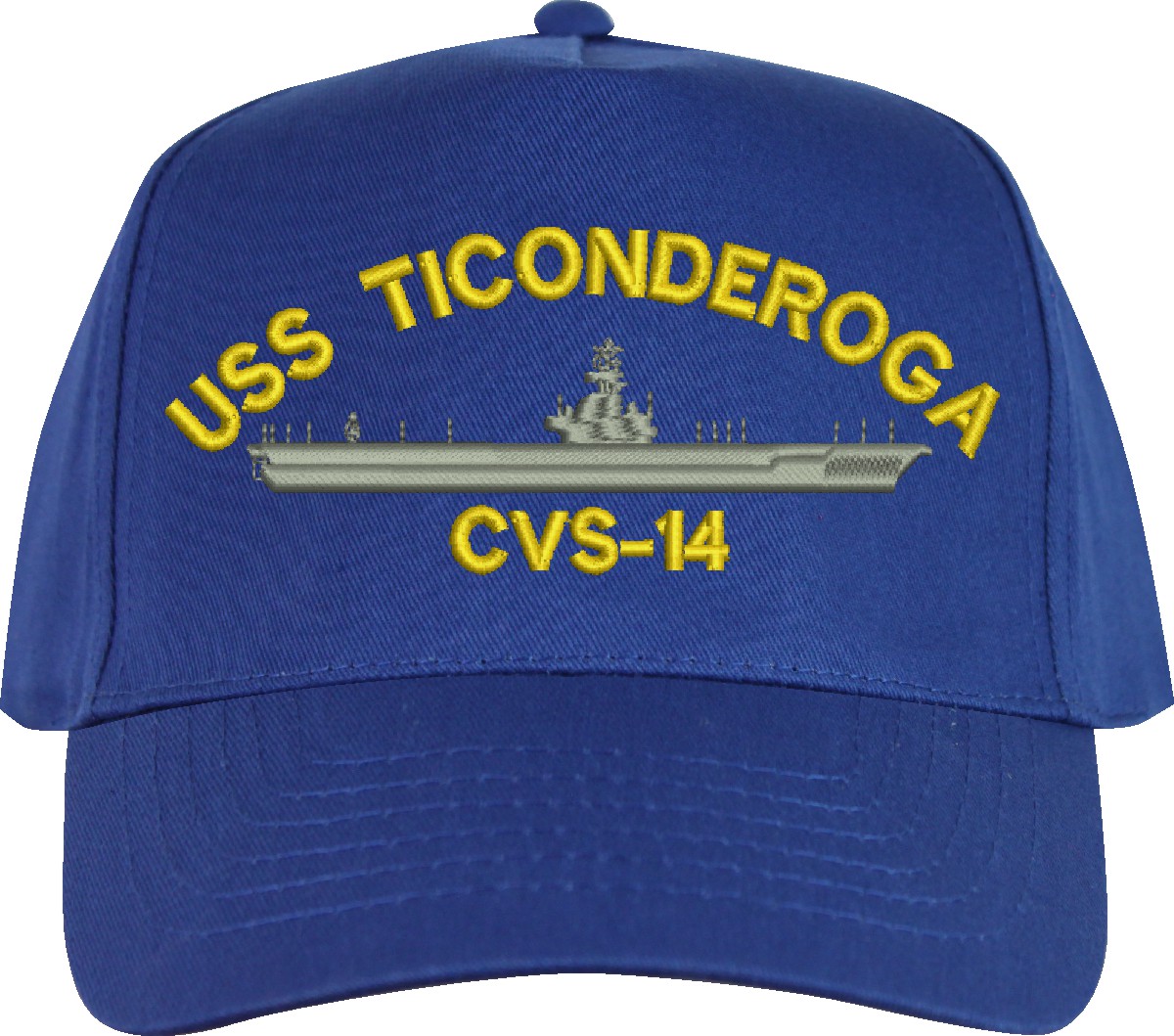 All Text on custom orders will be embroidered in ALL CAPITAL LETTERS.MilitaryBest is proud to offer this USS Ticonderoga CVS-14 Imported Cap. This Cap honors the service of our U.S. Navy personel who have served aboard this ship protecting our freedom with pride. Choose from an assortment of colors in High or Low Profile. These are perfect for honoring your USS Ticonderoga Navy Veteran. For an additional cost you can also have your Custom Text embroidered on the back of the ball cap. All embroidery is performed to order at our facilities in Scottsboro, Alabama by Americans with a passion for patriotism!