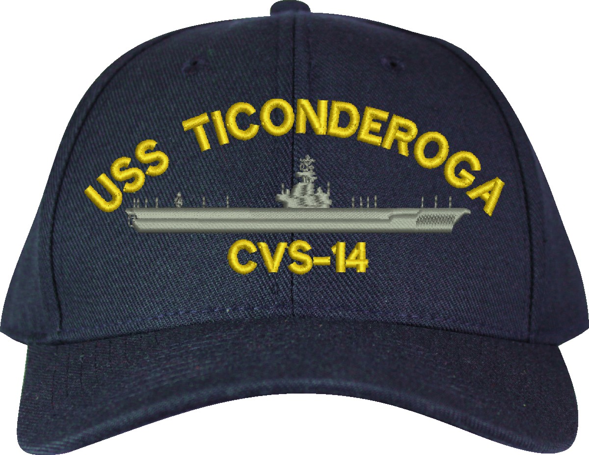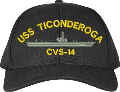 MilitaryBest is proud to offer this USS Ticonderoga CVS-14 Made in the USA Ball Cap. This Cap honors the service of our U.S. Navy personel who have served aboard this ship protecting our freedom with pride. Choose from Navy Blue or Black in High or Low Profile. These are perfect for honoring your USS Ticonderoga Navy Veteran. For an additional cost you can also have your Custom Text embroidered on the back of the ball cap. Embroidery on these Made in the USA caps is performed to order at our facilities in Scottsboro, Alabama by Americans with a passion for patriotism!