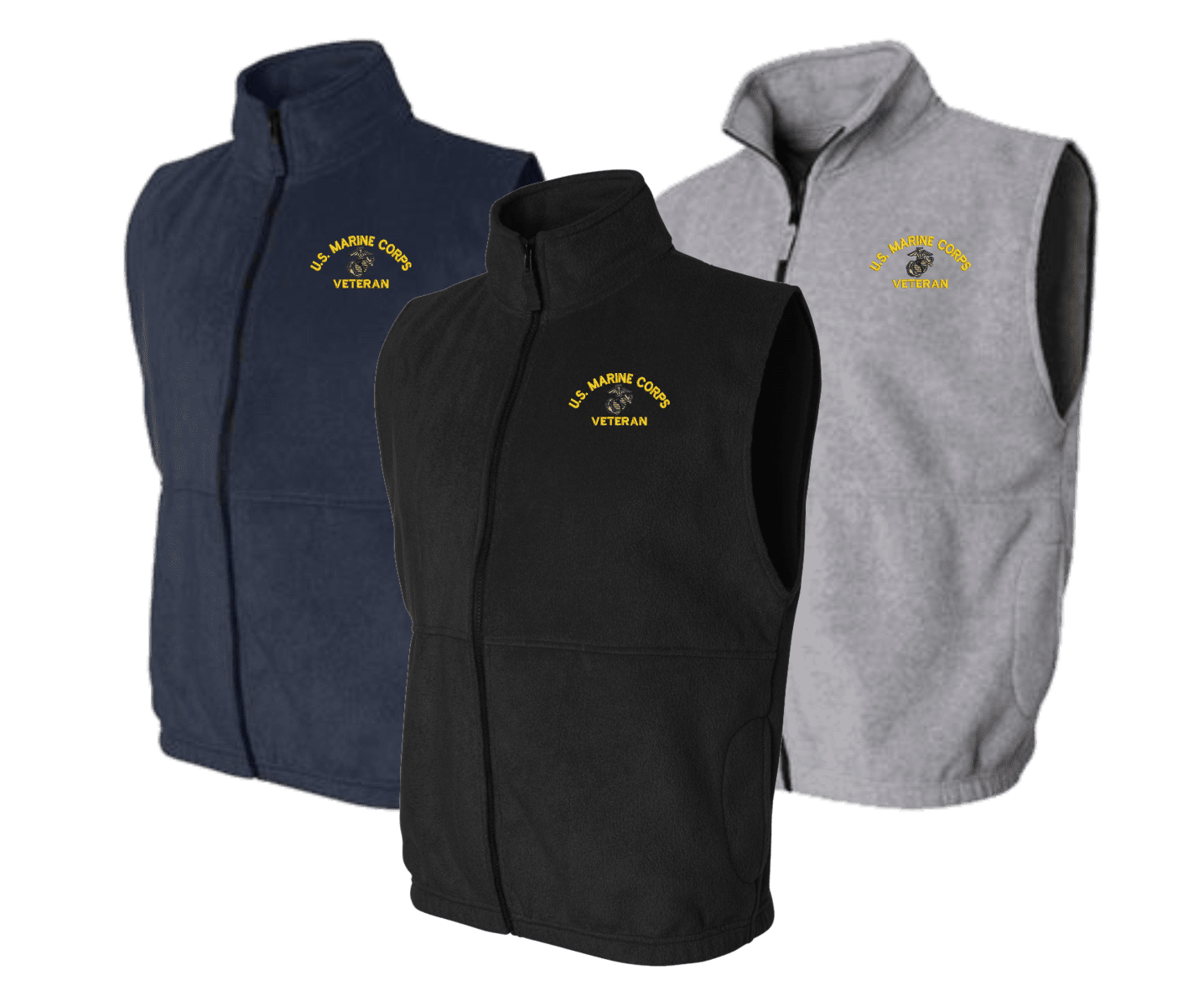 Due to supply chain disruptions, some colors and sizes may not be available in the same Brand, in these cases a brand of comparable quality will be used. Feel free to call in advance of your order, with questions you may have.MilitaryBest is expanding it's line of Men's apparel with this quality Custom U.S. Marine Corps Full Zip Fleece Vest. This Full-Zip Fleece Vests feature a convertible collar with dyed-to-match zipper pull, oversized nylon reinforced slash pockets, and an elastic hem. They are made out of 100% anti-pill polyester. This vest will make an excellent addition to your wardrobe, or a quality gift. Your satisfaction is guaranteed! All embroidery is done at our facilities in Scottsboro, AL.
