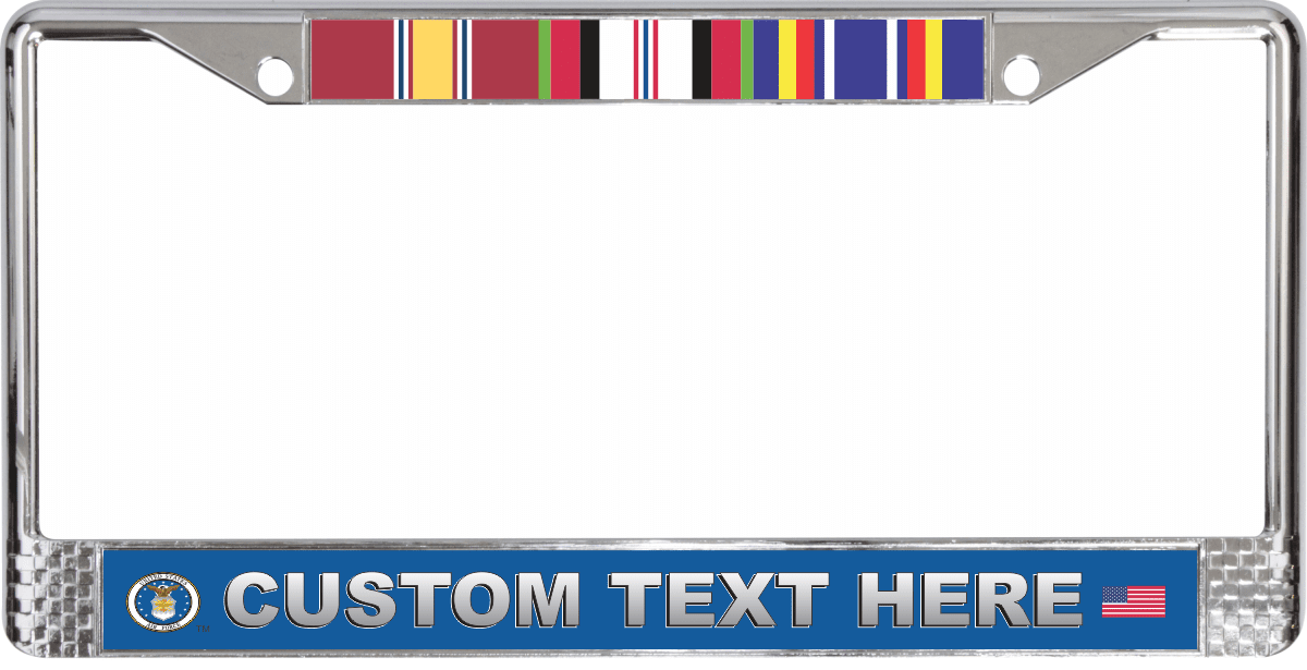 This Custom USAF Afghanistan Ribbon Frame 3-Ribbon Stack License Plate Frame is proudly produced in our facility in Scottsboro, Alabama. Each Chrome Dipped Alloy Frame has Poly Coated Aluminum Inserts which allow our production team to provide you with High Quality Designs. Each design is Sublimation Printed individually, and the end product provides a high gloss appearance of the design. Our Military License Plate Frames' quality are guaranteed. Custom Frames are non-returnable unless there is a defect with the frame or design.A percentage of the sale of each MilitaryBest item is forwarded to the licensing departments of each respective branch of service in support of the MWR (Morale, Welfare, & Recreation) program. These payments are made by either ALL4U LLC or the wholesaler from where the item originated. Our team thanks you for your service and your support of these programs.