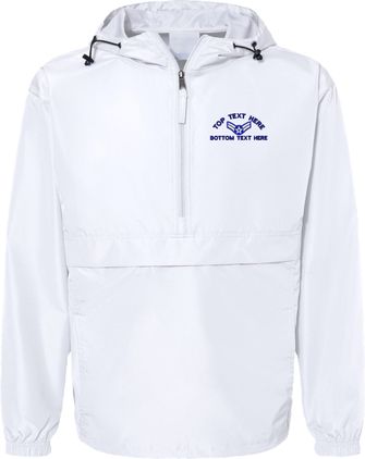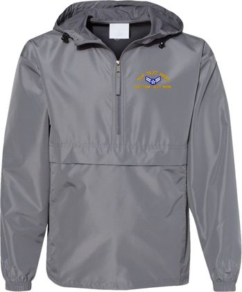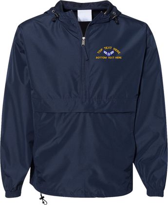 MilitaryBest is proud to offer this quality U.S. Air Force Custom Embroidered Hooded Windbreaker. Also known as an Anorak Jacket, this windbreaker is designed to keep wind and water out. With a design embroidered over the left chest, this windbreaker is embroidered to order at our facilities in Scottsboro, AL.. This windbreaker can be packed into the mesh lined pouch pocket for a more portable method of storage.