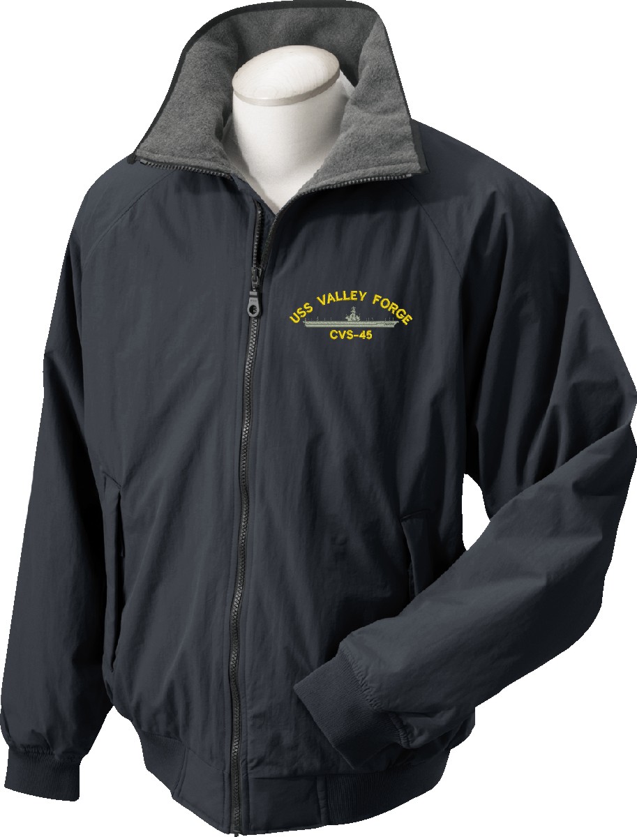 Note: Some of the Color Options pictured may not be available. Available Color Options are listed on the drop down menu above.All Text on custom orders will be embroidered in ALL CAPITAL LETTERS.MilitaryBest is expanding it's line of Men's and Women's apparel with this quality USS Valley Forge CVS-45 Jacket. This jacket is made from a 3-Layer system consisting of a nylon shell, an insulator layer, Nylon-lined sleeves, and an inside layer of fleece for comfort. The jacket features include a sturdy black enamel front-zipper, raglan sleeves, outsize zip pockets, an inside zip security pocket, YKK zippers, and a banded-bottom. This jacket will make an excellent addition to your wardrobe, or a quality gift. Your satisfaction is guaranteed! All embroidery is done at our facilities in Scottsboro, AL.