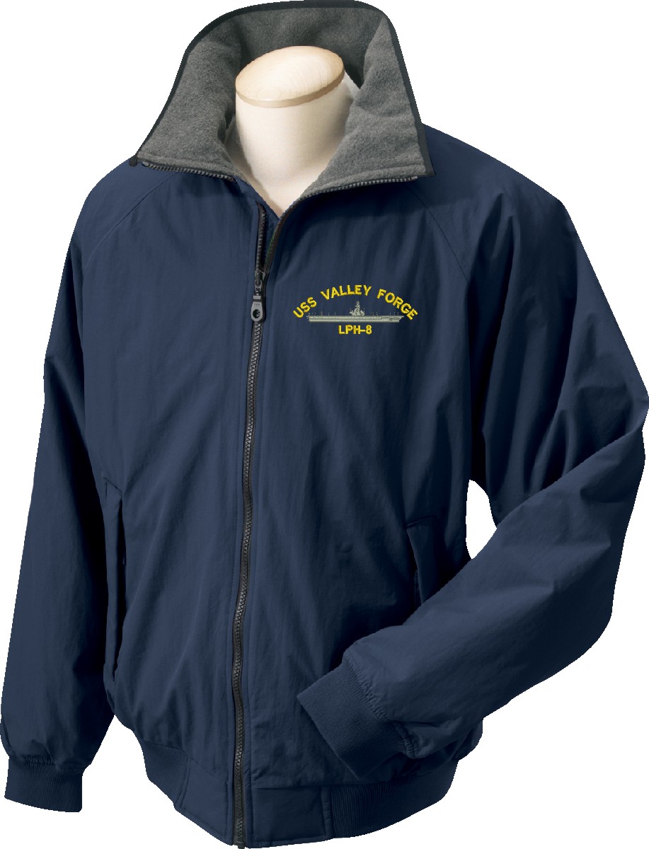 Note: Some of the Color Options pictured may not be available. Available Color Options are listed on the drop down menu above.All Text on custom orders will be embroidered in ALL CAPITAL LETTERS.MilitaryBest is expanding it's line of Men's and Women's apparel with this quality USS Valley Forge LPH-8 Jacket. This jacket is made from a 3-Layer system consisting of a nylon shell, an insulator layer, Nylon-lined sleeves, and an inside layer of fleece for comfort. The jacket features include a sturdy black enamel front-zipper, raglan sleeves, outsize zip pockets, an inside zip security pocket, YKK zippers, and a banded-bottom. This jacket will make an excellent addition to your wardrobe, or a quality gift. Your satisfaction is guaranteed! All embroidery is done at our facilities in Scottsboro, AL.