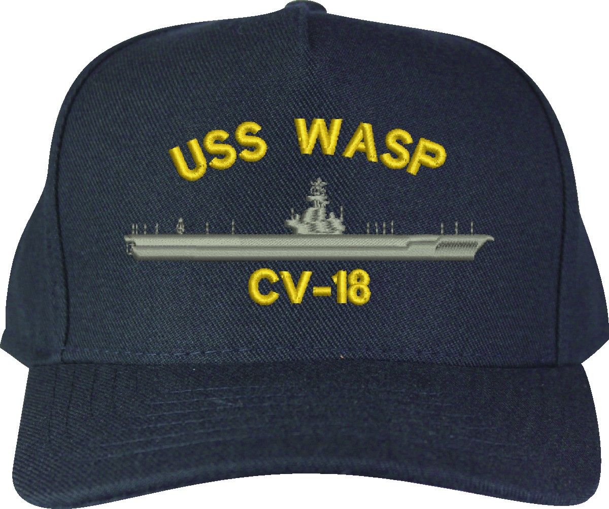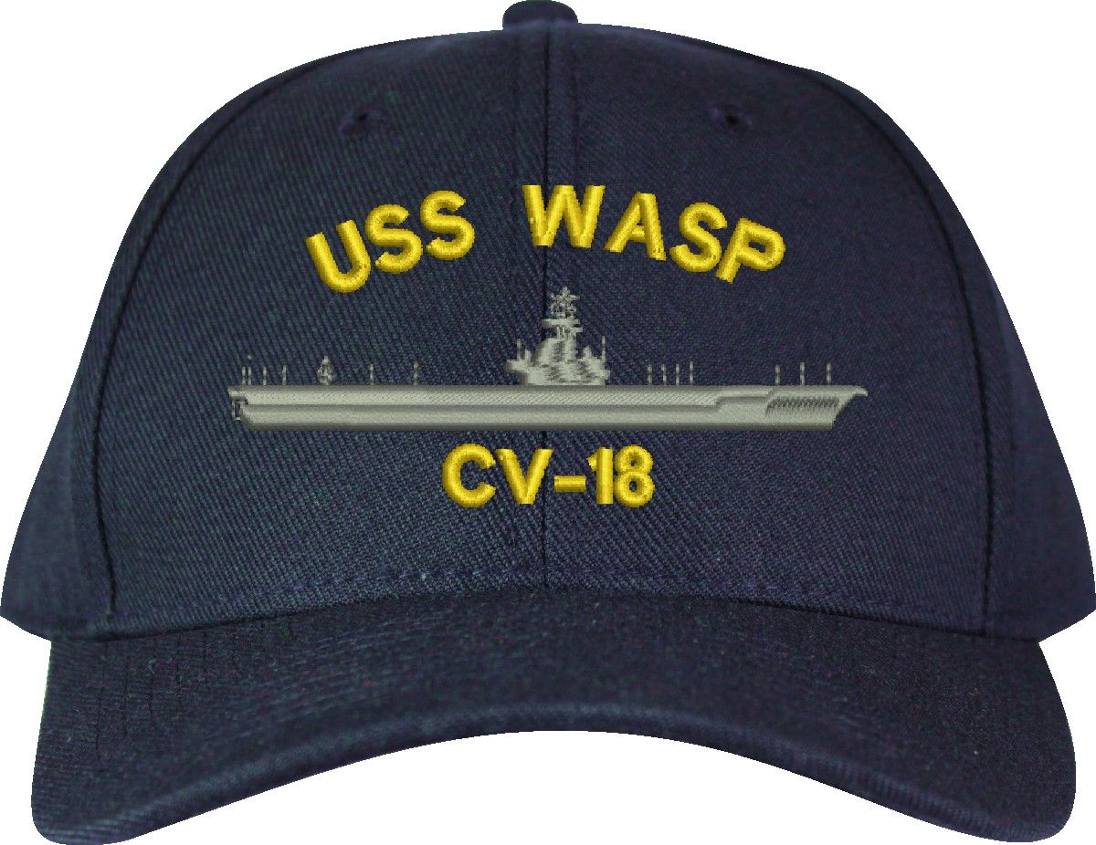 MilitaryBest is proud to offer this USS Wasp CV-18 Made in the USA Ball Cap. This Cap honors the service of our U.S. Navy personel who have served aboard this ship protecting our freedom with pride. Choose from Navy Blue or Black in High or Low Profile. These are perfect for honoring your USS Wasp Navy Veteran. For an additional cost you can also have your Custom Text embroidered on the back of the ball cap. Embroidery on these Made in the USA caps is performed to order at our facilities in Scottsboro, Alabama by Americans with a passion for patriotism!