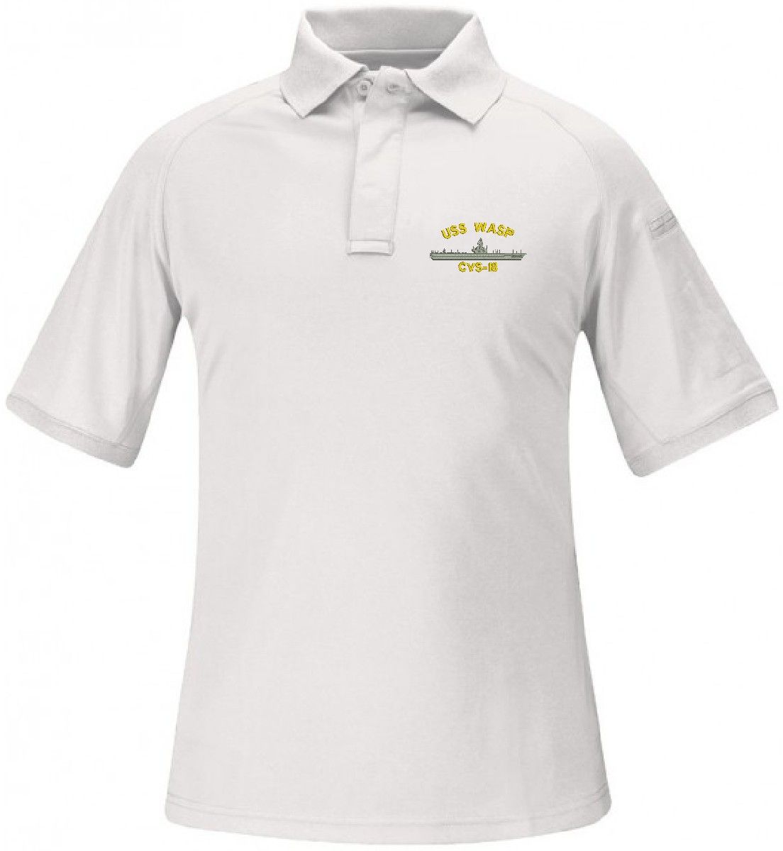 MilitaryBest is proud to offer this USS Wasp CVS-18 Propper Brand Snag Free Polo Shirt. These polos are Moisture Wicking with a knit so tight that the shirt will not snag. This Polo honors the service of our U.S. Navy personel who have served aboard this ship protecting our freedom with pride. Choose from Black, Navy Blue, and White in Sizes Small - 5XL. These are perfect for honoring your USS Wasp Navy Veteran. For an additional cost you can also have your Rank & Rate embroidered on the left sleeve of the Polo. All embroidery is performed to order at our facilities in Scottsboro, Alabama by Americans with a passion for patriotism!