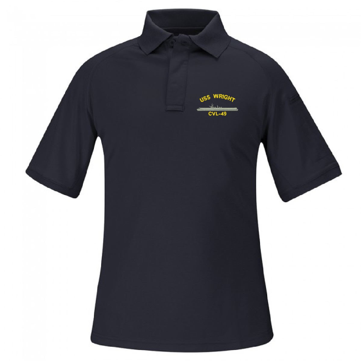 MilitaryBest is proud to offer this USS Wright CVL-49 Propper Brand Snag Free Polo Shirt. These polos are Moisture Wicking with a knit so tight that the shirt will not snag. This Polo honors the service of our U.S. Navy personel who have served aboard this ship protecting our freedom with pride. Choose from Black, Navy Blue, and White in Sizes Small - 5XL. These are perfect for honoring your USS Wright Navy Veteran. For an additional cost you can also have your Rank & Rate embroidered on the left sleeve of the Polo. All embroidery is performed to order at our facilities in Scottsboro, Alabama by Americans with a passion for patriotism!
