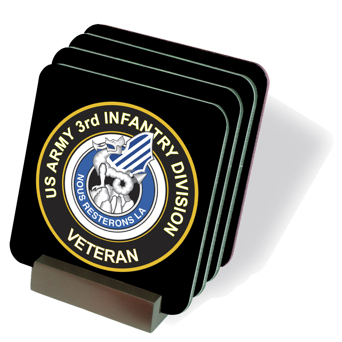 These U.S. Army 3rd Infantry Division Unit Crest Veteran drink coasters are proudly made in the USA and their quality is guaranteed! Each of our military drink coasters measure 3 ¾”, has a beautiful gloss finish and is manufactured with a soft cork underside to protect your furniture and prevent slipping. This set of coasters is accompanied by a handsome wood coaster holder display rack as shown in our picture above. We are proud to offer these U.S. Army drink coasters and hope that you’ll enjoy them for years to come. Purchase for yourself or as a Military Gift for a friend or loved one.