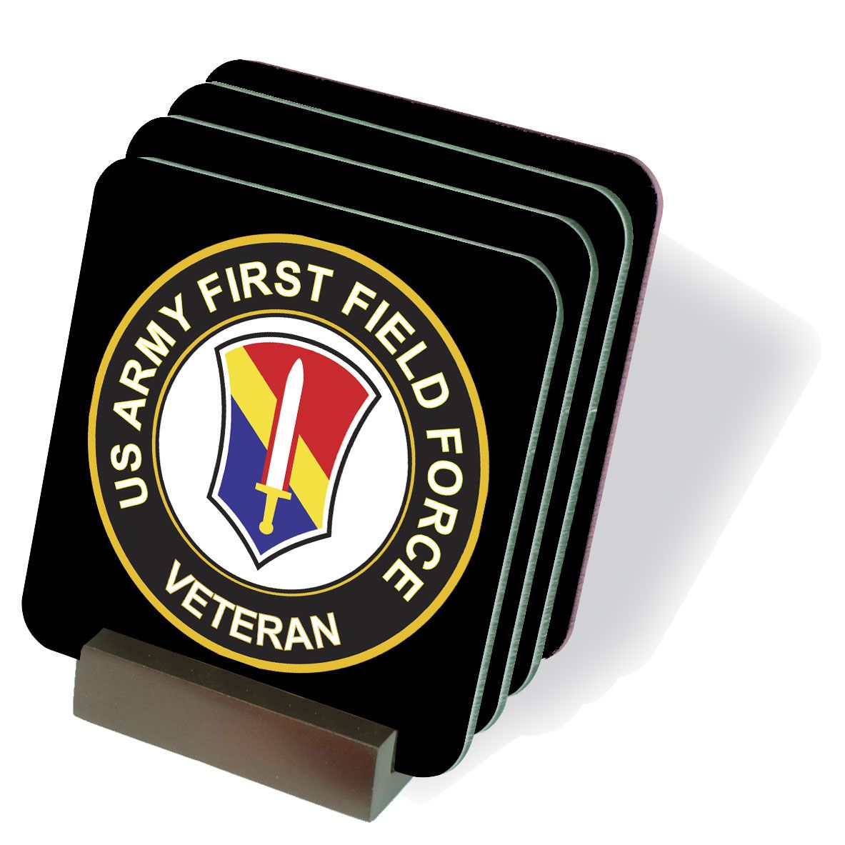 These U.S. Army First Field Force Veteran drink coasters are proudly made in the USA and their quality is guaranteed! Each of our military drink coasters measure 3 ľ”, has a beautiful gloss finish and is manufactured with a soft cork underside to protect your furniture and prevent slipping. This set of coasters is accompanied by a handsome wood coaster holder display rack as shown in our picture above. We are proud to offer these U.S. Army drink coasters and hope that you’ll enjoy them for years to come. Purchase for yourself or as a Military Gift for a friend or loved one.