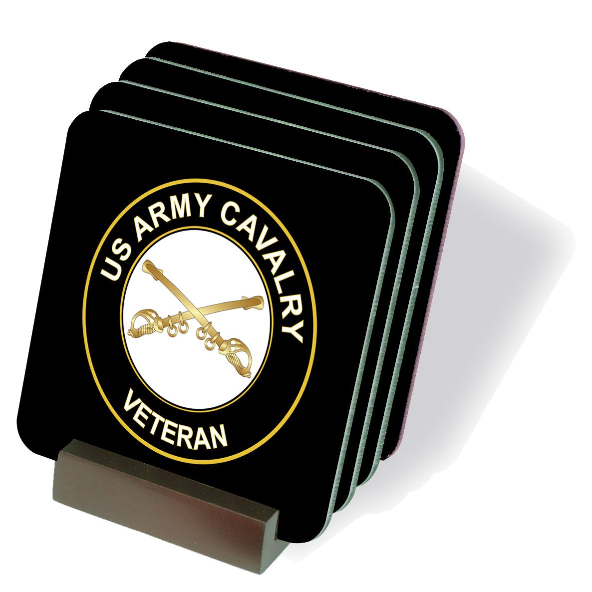 These U.S. Army Veteran Cavalry drink coasters are proudly made in the USA and their quality is guaranteed! Each of our military drink coasters measure 3 ¾”, has a beautiful gloss finish and is manufactured with a soft cork underside to protect your furniture and prevent slipping. This set of coasters is accompanied by a handsome wood coaster holder display rack as shown in our picture above. We are proud to offer these U.S. Army drink coasters and hope that you’ll enjoy them for years to come. Purchase for yourself or as a Military Gift for a friend or loved one.
