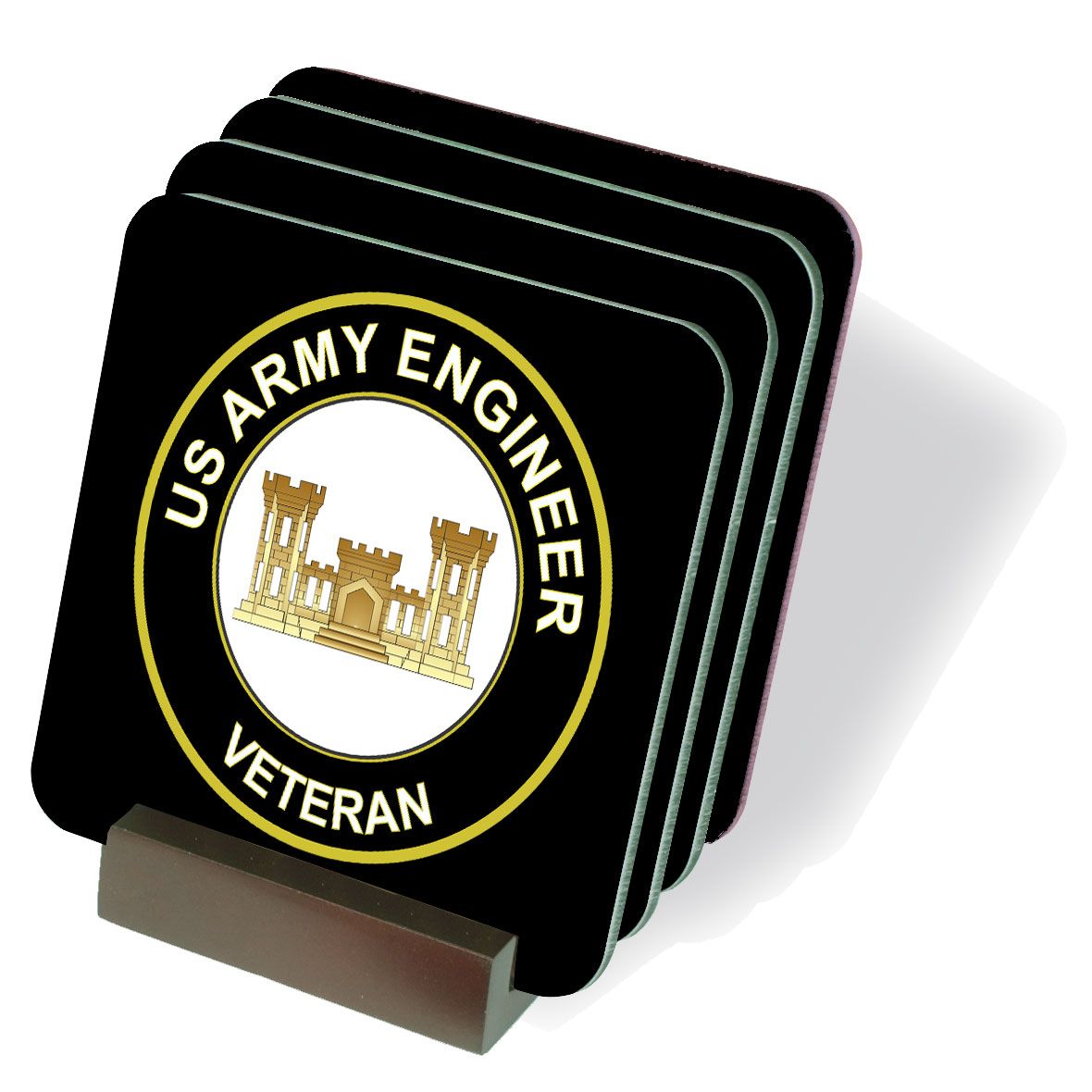 These U.S. Army Veteran Army Engineer drink coasters are proudly made in the USA and their quality is guaranteed! Each of our military drink coasters measure 3 ¾”, has a beautiful gloss finish and is manufactured with a soft cork underside to protect your furniture and prevent slipping. This set of coasters is accompanied by a handsome wood coaster holder display rack as shown in our picture above. We are proud to offer these U.S. Army drink coasters and hope that you’ll enjoy them for years to come. Purchase for yourself or as a Military Gift for a friend or loved one.