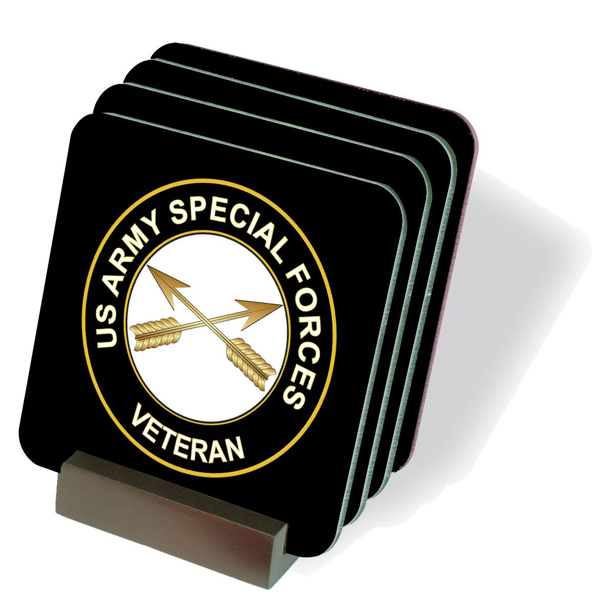 These U.S. Army Veteran Special Forces drink coasters are proudly made in the USA and their quality is guaranteed! Each of our military drink coasters measure 3 ¾”, has a beautiful gloss finish and is manufactured with a soft cork underside to protect your furniture and prevent slipping. This set of coasters is accompanied by a handsome wood coaster holder display rack as shown in our picture above. We are proud to offer these U.S. Army drink coasters and hope that you’ll enjoy them for years to come. Purchase for yourself or as a Military Gift for a friend or loved one.