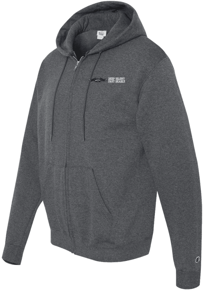 MilitaryBest is proud to offer this quality U.S. Navy Enlisted Silver Dolphins Deep Silent Fast Deadly Zippered Hoodie. Each U.S. Navy Zippered Hoodie is direct embroidered onto either a Champion or Gildan brand Zippered Hoodie using a 9.5 oz 50/50 Cotton Poly blend material. These Military Zippered Hoodies are proudly embroidered at our facilities in Scottsboro, AL.