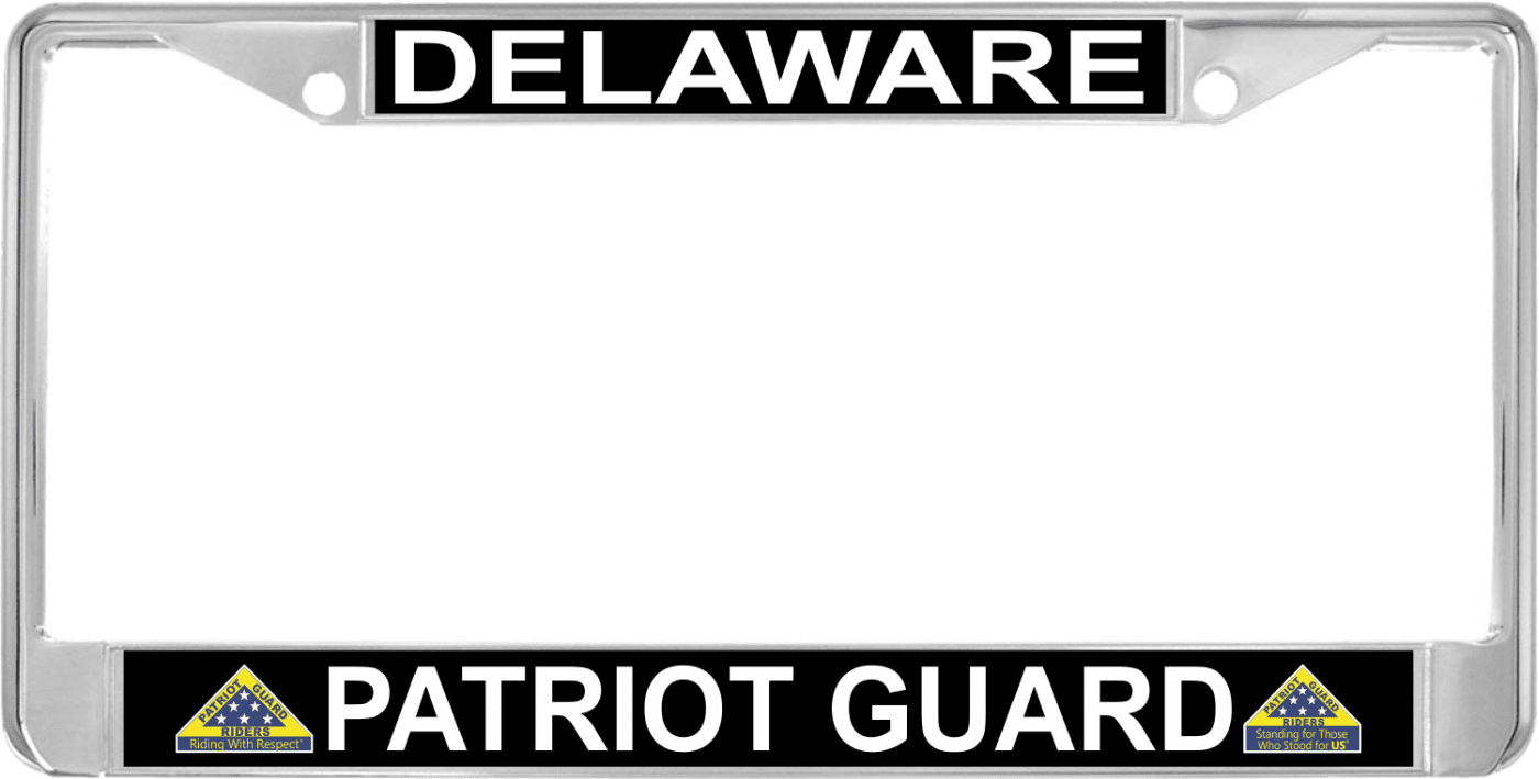 This Delaware Patriot Guard Automobile License Plate Frame is proudly produced at our facility in Scottsboro, Alabama. Each Chrome Dipped Alloy Frame has Poly Coated Aluminum Inserts which allow our production team to provide you with High Quality Designs. Unfortunately, this frame is not offered as a Motorcycle Frame.Please check with your state and local regulations regarding suitability for displaying this Automobile License Plate Frame on your vehicle since these regulations may have changed in your state. Various weather and road conditions may impact the life span of your frame e.g. salted roads, long exposure to direct sunlight etc.