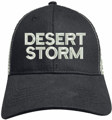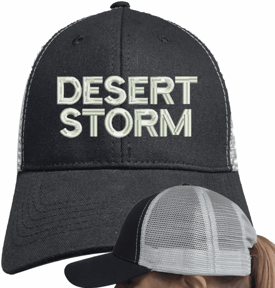 MilitaryBest is proud to offer this Desert Storm Text Only Mesh-Back Ponytail Cap. The design of this Cap is perfect for not only ponytails, but also dreads, buns, and many other types of hair styles! Simply pull hair through slot, adjust to the desired style, and tighten the ponytail holder. The design is embroidered to the cap by our team at our facilities in Scottsboro, Alabama. As with all MilitaryBest items, your satisfaction is guaranteed!A percentage of the sale of each MilitaryBest item is forwarded to the licensing departments of each respective branch of service in support of the MWR (Morale, Welfare, & Recreation) program. These payments are made by either ALL4U LLC or the wholesaler from where the item originated. Our team thanks you for your service and your support of these programs.