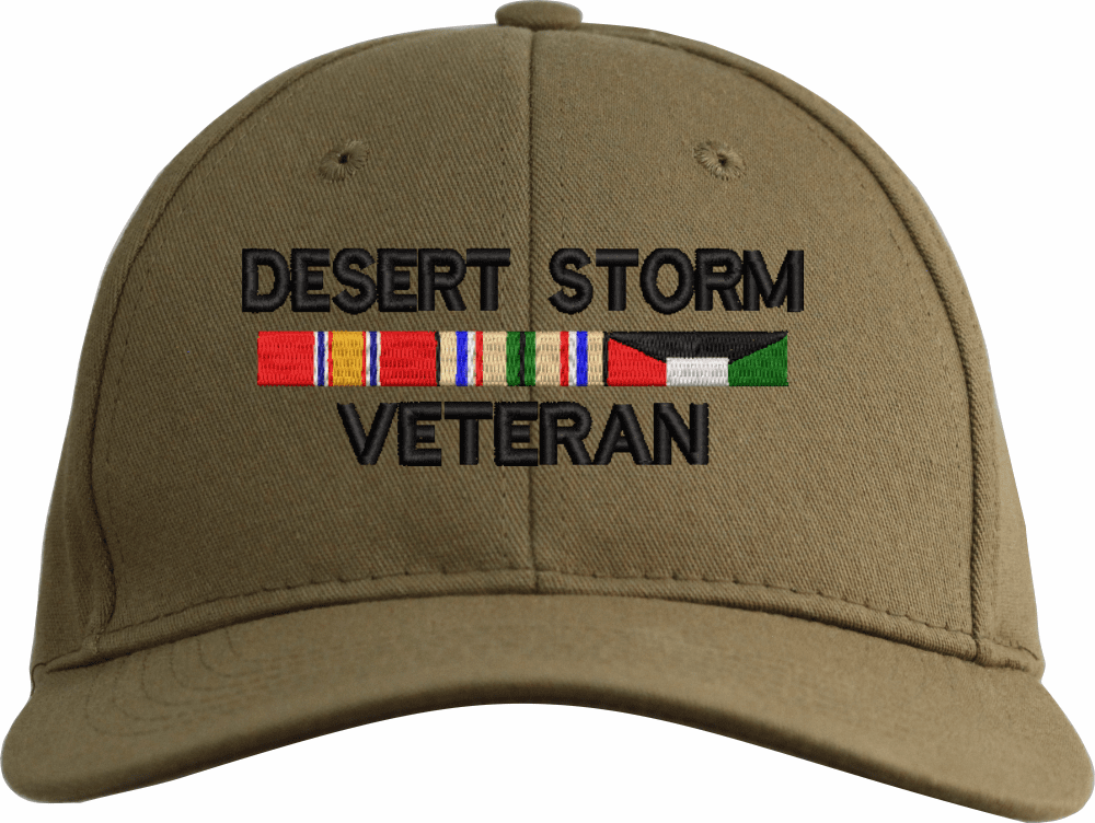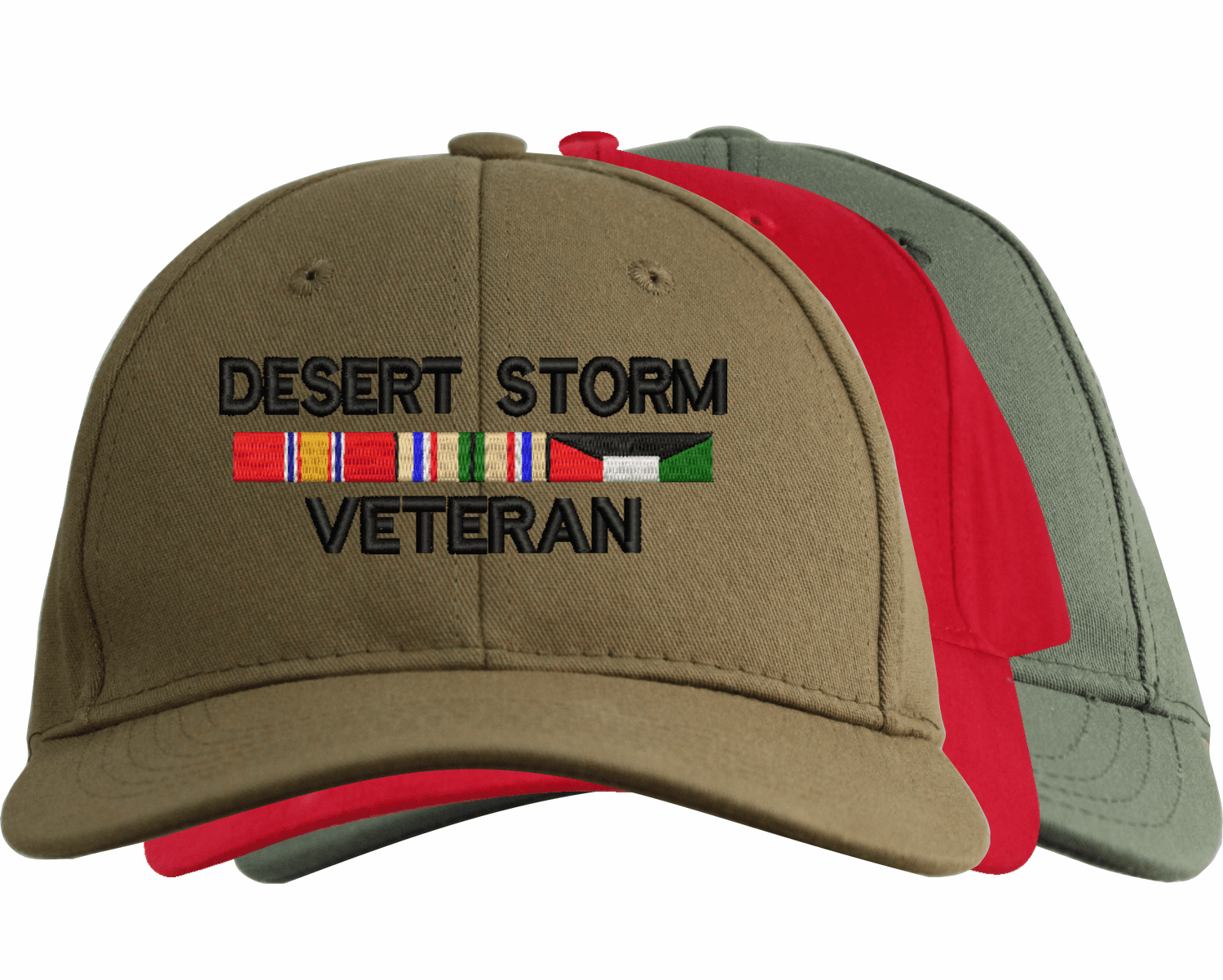 MilitaryBest is proud to offer this Desert Storm Veteran War Conflict 3-Ribbon Stack Made In USA Cap. This War Conflict Ribbon Cap is embroidered at our facilities in Scottsboro, AL by skilled craftsmen with a passion for patriotism. Your satisfaction is guaranteed!Caps ordered with embroidered back text requires an additional 1 to 2 days of production time. All personalized caps will be embroidered in ALL CAPITAL LETTERS. Caps personalized with back text are not returnable unless there is a material defect in the cap.