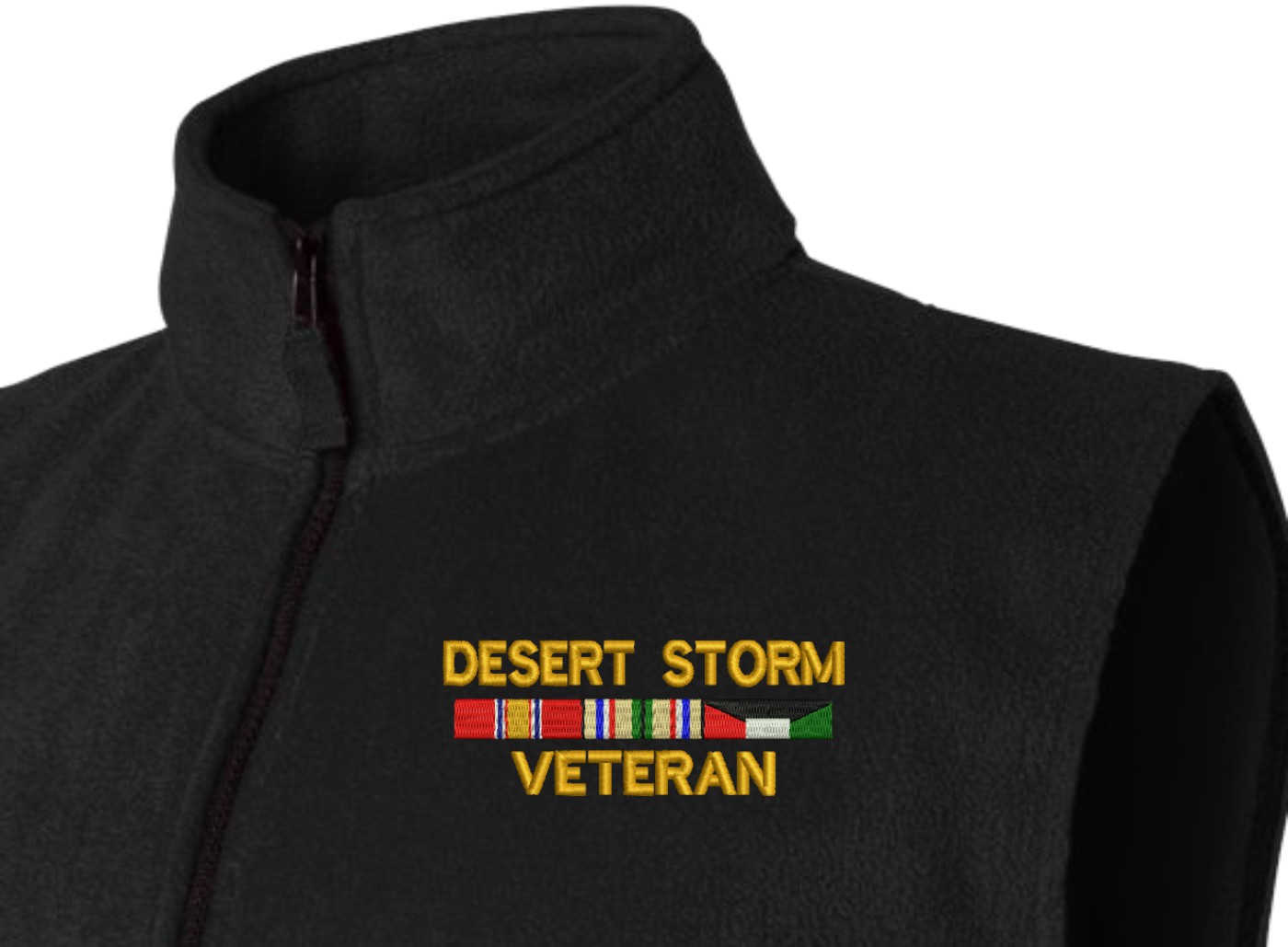 Due to supply chain disruptions, some colors and sizes may not be available in the same Brand, in these cases a brand of comparable quality will be used. Feel free to call in advance of your order, with questions you may have.MilitaryBest is expanding it's line of Men's apparel with this quality Desert Storm Veteran 3 Ribbons Full-Zip Fleece Vest. This Full-Zip Fleece Vests feature a convertible collar with dyed-to-match zipper pull, oversized nylon reinforced slash pockets, and an elastic hem. They are made out of 100% anti-pill polyester. This vest will make an excellent addition to your wardrobe, or a quality gift. Your satisfaction is guaranteed! All embroidery is done at our facilities in Scottsboro, AL.