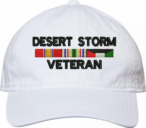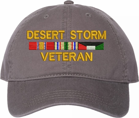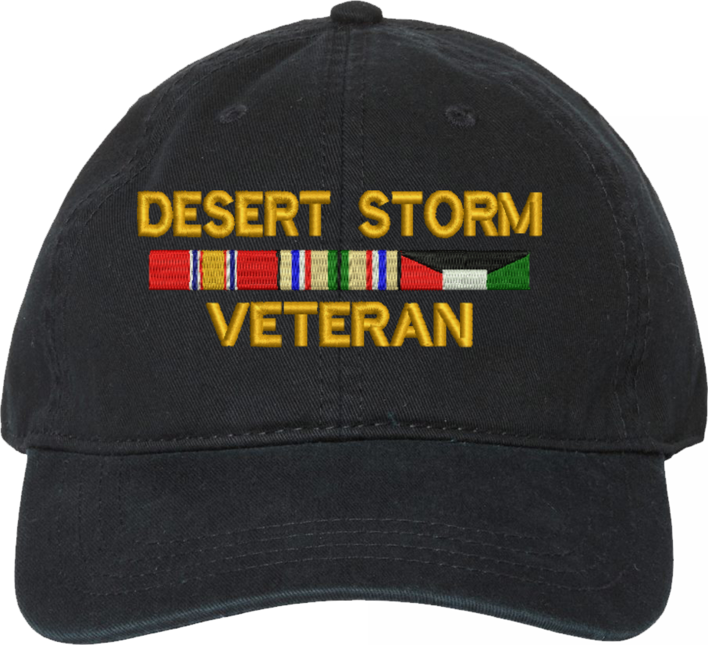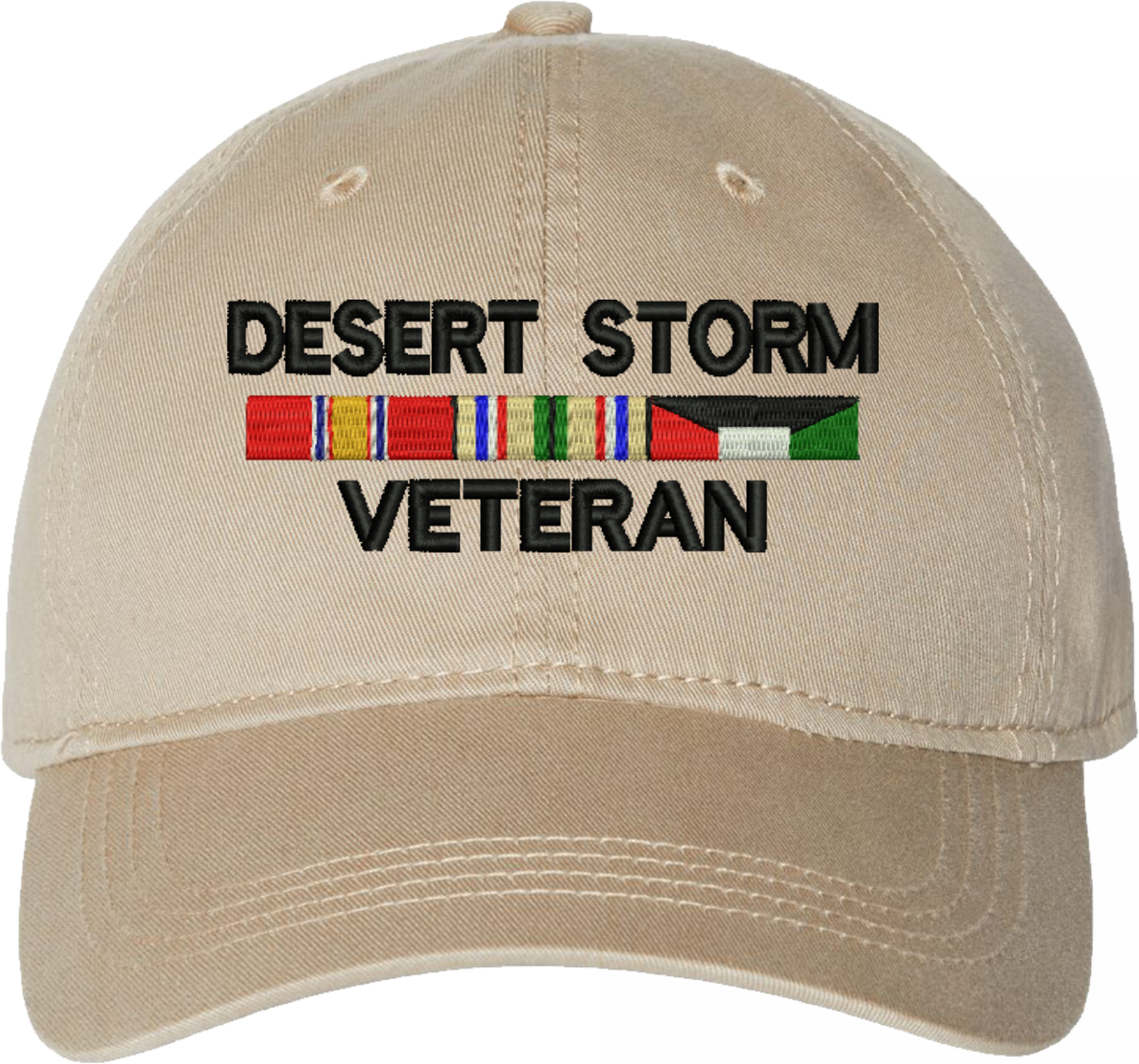 Show your military pride with this Desert Storm Veteran with 3 Service Ribbons Unstructured Dad Cap from MilitaryBest. Crafted from 100% washed chino twill cotton, this six-panel, low-profile cap offers a relaxed and comfortable fit. Featuring high-quality embroidery done in our Scottsboro, Alabama facility, this cap is designed with a pre-curved visor and an adjustable tri-glide buckle closure for a perfect fit. Whether for everyday wear or as a meaningful gift, this cap is a great way to honor your own or a loved one's service.For caps ordered with custom embroidered personalized text please allow an additional 3 to 5 days production time. All custom back text will be embroidered in ALL CAPITAL LETTERS. Caps with back text or eggs are non-returnable unless there is a material defect in the cap.